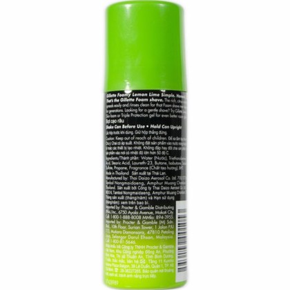 Gillette Foamy Lemon Lime Đơn giản. Gần gũi. Cổ điển. Đó chính là bọt cạo râu Gillette. Giàu dưỡng chất,bọt hương chanh lan tỏa và làm sạch nhẹ nhàng vì thế bọt cạo râu nam được ưa chuộng qua nhiều thời đại. Bạn muốn tìm kiếm một sự cạo râu dịu nhẹ? Hãy dùng thử bọt cạo Gillette Series Sensitive Skin hoặc gel bảo vệ 3 tác động Triple Protection để cạo râu được mượt mà hơn. Thành phần: Water,Triethanolamine,Palmitic Acid,Stearic Acid,Laureth-23,Butane, Isobutane,Sodium Lauryl,Sulfate,Propane, Fragrance(chất tạo hương),BHT. Cách dùng: lắc trước khi dùng. Giữ hộp thẳng đứng. Sản xuất tại Thái Lan.