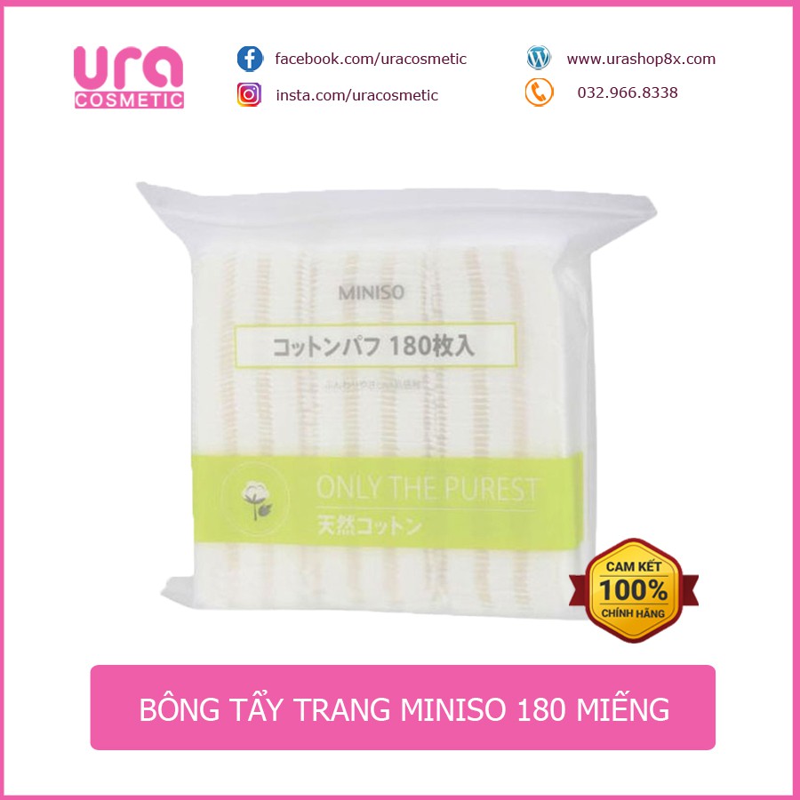 180 miếng - dạng túi, bông vuông, dày, dùng tẩy trang hay toner Bông tẩy trang Miniso được làm từ 100% sợi bông tự nhiên, mềm mịn giúp lấy đi được lớp bụi bẩn và trang điểm trên da rất tốt. Đặc biệt khả năng thấm hút của em này khá tốt nên không làm tốn dung dịch, được nhiều bạn gái yêu thích và lựa chọn.