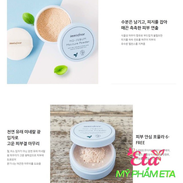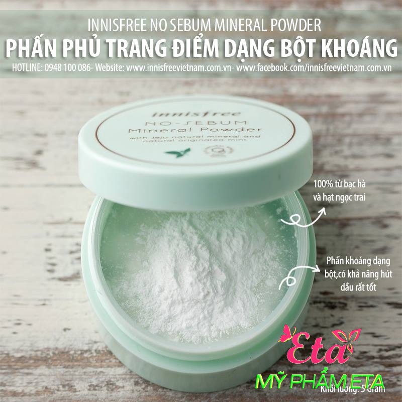 Phấn phủ bột Innisfree NO SEBUM Powder trắng hồng hiệu quả của Hàn Quốc Xuất xứ: Hàn Quốc Thương hiệu: Innisfree Phân loại: Mineral Powder (Kiềm dầu cho da dầu, da hỗn hợp), Moisture (Kiềm dầu cho da khô) và Blur (Trang điểm) 1. Mô tả: - Innisfree No Sebum Powder là phấn phủ dạng bột được chiết xuất từ các khoáng chất tự nhiên của đảo Jeju Hàn Quốc và chiết xuất bạc hà tạo cảm giác thư giãn nhẹ dịu cho da, giúp kiểm soát lượng dầu nhờn, mồ hôi và điều chỉnh độ ẩm giúp da mịn màng trắng sáng. - Phấn phủ Innisfree No Sebum Powder hoàn toàn chiết xuất từ tự nhiên lành tính, những hạt phấn nhỏ tác dụng hút nhiều dầu, mồ hôi, điều chỉnh độ ẩm trên da giúp da mềm mại, thông thoáng không bị bí dầu. Phấn phủ dạng bột Innisfree No Sebum Powder có tone màu trắng trong suốt, lên da không có màu, giúp bạn có làn da sáng nhẹ. Công thức kiểm soát dầu nhờn vượt trội, giữ được lớp makeup lâu trôi đến 24 giờ đồng hồ. Đặc biệt, sản phẩm có khả năng tạo độ ẩm cân bằng trên da giúp da thông thoáng không bị bí dầu. Sản phẩm Innisfree No Sebum Powder có độ che phủ hiệu quả, giúp da mịn mượt và tự nhiên đầy sức sống. Các thành phần tự nhiên rất an toàn và lành tính với da, đặc biệt là làn da dễ mẩm cảm với các loại phấn phủ. 2. Phân loại: Có 2 loại phấn bột kiềm dầu (Mineral Powder và Moisture Powder) và phấn bột trang điểm (Blur Powder) – Innisfree No Sebum #MineralPowder: Phấn bột kiềm dầu dành cho da dầu và da hỗn hợp, trong đó chỉ khác nhau màu vỏ: + Vỏ Hồng + Vỏ Vàng + Vỏ Tím + Vỏ Xanh Lục + Vỏ Xanh Biển + Vỏ Cam Nâu – Innisfree #No-Sebum #MoisturePowder: Phấn bột kiềm dầu dành cho da khô. – Innisfree #NoSebum #BlurPowder: Phấn bột trang điểm. – Follow Shop: Dành cho khách THEO DÕI SHOP, chỉ 1 lần bấm giá sẽ được ưu đãi nhiều lần. Trường hợp này nếu bạn ko bấm THEO DÕI SHOP, sản phẩm sẽ ko được gửi đi (Shop sẽ bù tiền vào trong gói hàng ạ). – Ko Follow Shop: Dành cho khách KO THEO DÕI SHOP. 3. Hướng dẫn sử dụng: - Sử dụng ở bước cuối cùng để hoàn tất lớp trang điểm, chú ý phủ kỹ ở những vùng bị dầu nhiều, tạo lớp trang điểm nhẹ nhàng hàng ngày. - Lấy phấn bằng bông phấn hoặc chổi chà vào phấn để phấn bám đủ vào bông hoặc chổi. gõ nhẹ cho các hạt phấn thừa rơi đi rồi mới đánh lên mặt - Chấm bông phấn hoặc chổi lần lượt the o các vị trí cơ bản là: Trán (1) – Dọc sống mũi (2) – Hai bên mắt (3) – Thái dương (4) – Má (5) – Dưới mũi (6) – Hai bên hàm (7) – Cằm (8). chuyển động bông/ chổi theo hướng đi xuống, vì cấu tạo của da và lông trên mặt theo hướng xuôi chiều xuống - Tiếp tục làm như vậy cho đến khi đặt lòng bàn tay lên mặt thấy khô mà mát là vừa đủ. #phấnbột #phanphubot #phanphu #phanbot #powder