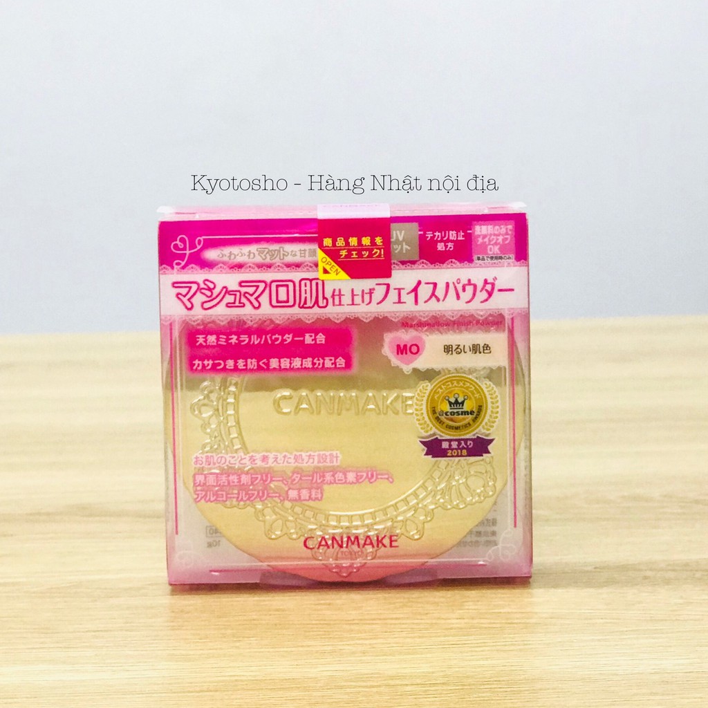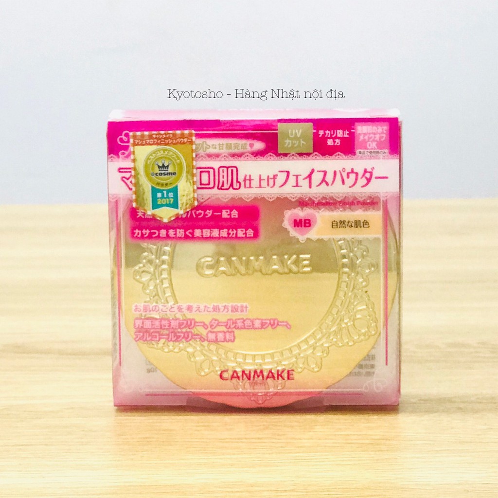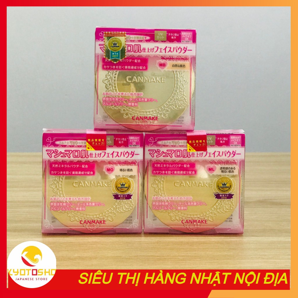 Lấy cảm hứng từ những viên kẹo dẻo ngọt ngào và mềm mại, thương hiệu Canmake đã cho ra đời dòng phấn phủ Canmake Marshmallow Finish Powder với công thức đặc biệt giúp hấp thụ bã nhờn, kiểm soát dầu thừa, đem lại lớp trang điểm bền màu và gương mặt tỏa sáng rạng rỡ. TÔNG MÀU - Màu MO (Matte Ochre): tone sáng da sẽ làm làn da bạn trông sáng hơn, phù hợp với những bạn có làn da trắng hoặc trung tính. Bạn nào da trắng đánh màu này sẽ tiệp màu da, da trung tính dùng màu này sẽ tạo lớp trang điểm trắng hơn màu da. - Màu ML (Matte Light Ochre): tone trắng sáng tạo sự mơ màng quyến rũ rất thích hợp với những bạn có làn da trắng. - Màu MB (Matte Beige Ochre): tone màu da, dễ dàng hài hòa với màu da của bạn, phù hợp với các bạn có màu da trung tính hoặc da ngăm. Dùng cho da trung tính sẽ tiệp màu da, tạo lớp trang điểm tự nhiên, da ngăm dùng màu này sẽ sáng hơn màu da một tone, giúp da bạn trắng sáng hơn. ƯU ĐIỂM CỦA PHẤN PHỦ CANMAKE Chỉ số chống nắng SPF26 PA++ giúp tăng cường bảo vệ da khỏi tác hại của tia UVA và UVB. Chất phấn mềm mịn, không bụi và khi đánh tạo cảm giác mát, gần như không mùi. Đánh lên da là hút dầu luôn, hết bóng mặt nhưng không bị lì, cho hiệu ứng tự nhiên. Không dùng phụ gia khoáng chất để tốt cho làn da. Tốt cho làn da bạn với 72% thành phần là khoáng chất. Không hoạt chất bề mặt, không chất nhuộm màu gốc hắc ín, không cồn, không chất tạo hương THÀNH PHẦN Chứa các thành phần mĩ phẩm bảo vệ da không bị khô nhám. Thành phần dưỡng ẩm được chiết xuất từ lá lô hội, hương thảo, cúc Chamomile, nước chanh. Thành phần dưỡng da được chiết xuất từ hạt dẻ ngựa, lá tía tô. Thành phần làm mềm da được dẫn xuất Squalance, dầu Ô liu, dầu Jojoba, dầu hạt nho. Chứa phấn che phủ để phủ kín lỗ chân lông và vùng da không đều màu. Kết hợp hai loại hạt phấn mịn hình cầu có kích cỡ khác nhau để tạo hiệu ứng khuếch tán ánh sáng giúp khó thấy các khiếm khuyết như lỗ chân lông hay vùng da không đều màu Phấn được nén theo kiểu dáng gọn gàng giúp dễ dàng cất trong túi xách.