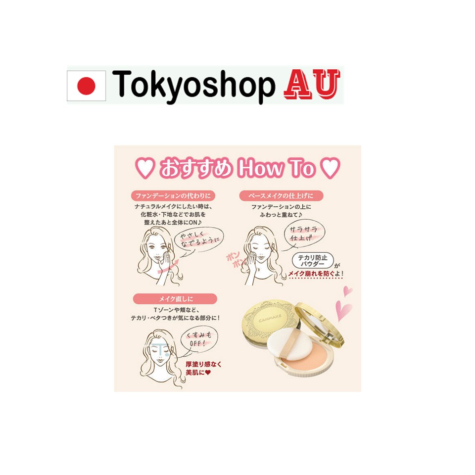 Canmake Marshmallow Finish Powder – phấn phủ dạng hộp nén có thể khiến bạn yêu ngay từ cái nhìn đầu tiên với packing xinh xắn, đáng yêu như một nàng công chúa cùng kết cấu phấn mịn mướt cho mọi lớp nền trở nên mềm mại và ngọt ngào hệt như những viên kẹo Marshmallow. Không chỉ là phấn phủ “trang điểm” thông thường, Canmake Marshmallow Finish Powder với thành phần có đến 72% khoáng chất cùng các chiết xuất từ lá lô hội, hoa cúc Chamomile, hạt dẻ ngựa,… giúp nuôi dưỡng làn da luôn đủ ẩm, đủ mềm mướt, phấn luôn được trượt êm trên da, nhẹ và tự nhiên. Chỉ số chống nắng SPF26 PA++ giúp da bạn được bảo vệ dưới nắng. Canmake đã rất tinh tế khi kết hợp 2 loại hạt phấn mịn có kích cỡ khác nhau để khuếch tán ánh sáng, tạo lớp phấn phủ sáng mờ có thể che giấu hoàn hảo cho các lỗ chân lông cùng vùng da không đều màu. Làn da bạn không chỉ mướt mềm mà còn sáng bừng lên ngay tức khắc. Thêm vào đó Canmake Marshmallow Finish Powder còn có khả năng hấp thụ lớp dầu thừa trên da, hạn chế tình trạng da bóng nhờn nhờ đó mà lớp trang điểm luôn giữ được vẻ tươi mới trong nhiều giờ. Cách dùng: – Thực hiện theo cách trang điểm thông thường: Săn sóc da → Đánh phấn lót → Đánh phấn nền (nên dùng phấn dạng nước hay kem) → Đánh phấn phủ Marshmallow. – Lấy một ít phấn lên bông phấn, vỗ nhẹ bông phấn lên mu bàn tay để rũ bớt phấn thừa trước khi thoa phấn. – Không cần chất tẩy rửa đặc biệt, tẩy trang theo cách rửa mặt bình thường. 素肌感のある軽い仕上がりになる自然派ミネラルパウダーを71%配合。 ソフトフォーカス効果のあるカバーパウダーが、気になる毛穴や、お肌の凹凸を目立ちにくくします。お肌にスッとなじみやすいマットベージュオークル。メイクオフの際は、クレンジング不要で、洗顔料のみでOK!界面活性剤フリー、タール系色素フリー、アルコールフリー、無香料