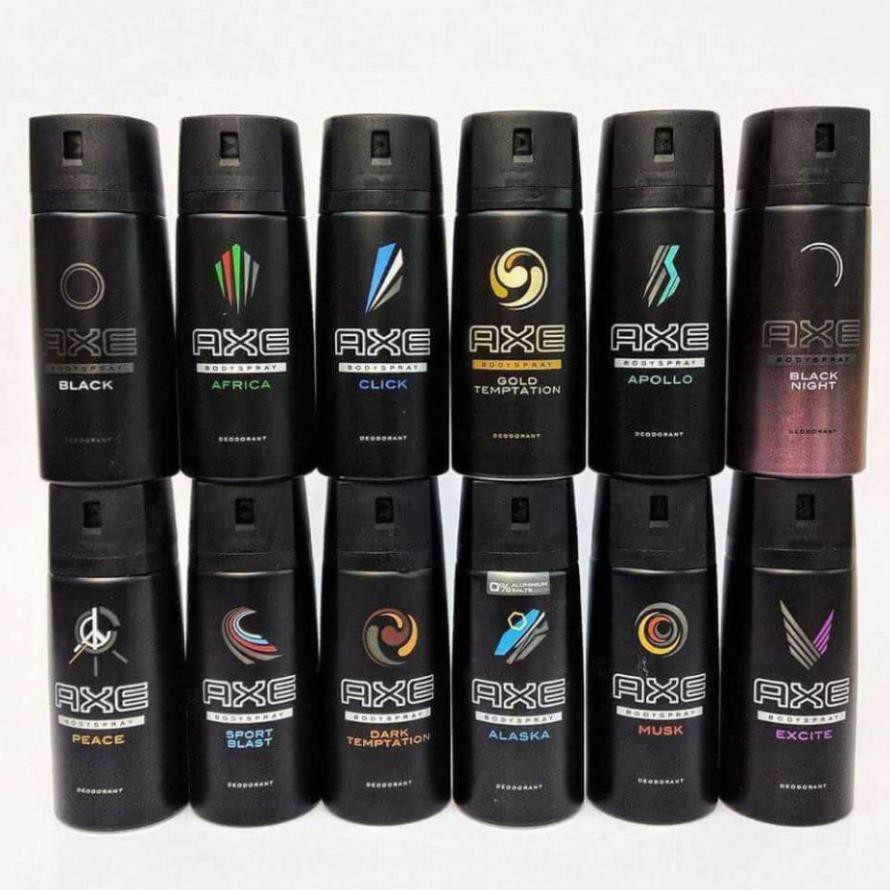 FULL 10 MÙI Xịt khử mùi toàn thân Axe - 150ml THOẢI MÁI LỰA CHỌN MÙI ƯNG Ý. Đặc điểm nổi bật: Khả năng ngăn mùi suốt 24h Ngăn ngừa tiết mồ hôi hiệu quả Hương thơm nam tính quyến rũ Thích hợp với mọi loại da Tạo sự khô thoáng suốt cả ngày Xuất xứ tại Thái Lan AXE là thương hiệu của Anh và Hà Lan Dung tích 150ml Xịt Khử Mùi Cho Nam Axe Body Spray là thương hiệu nổi tiếng với các dòng sản phẩm chuyên biệt dành cho nam giới có doanh số bán chạy nhất thế giới.Xịt khử mùi Axe giúp các chàng ngăn ngừa mồ hôi hiệu quả suốt 24h, tạo cảm giác khô thoáng và mang đến hương thơm đầy sảng khoái, tươi mát cho cơ thể. - Thiết kế chai ấn tượng, cùng dạng xịt rất tiện lợi, giúp các men lì nhà mình dễ dàng mang theo sử dụng bất cứ khi nào cần. - Công thức tối ưu cùng các phân tử ngăn mùi siêu nhỏ giúp khử sạch mùi khó chịu trên cơ thể, để bạn thoải mái vận động ở mọi lúc, mọi nơi. - Sản phẩm chiết xuất từ các thành phần thiên nhiên nên rất an toàn, không gây hại cho da và thích hợp cho da nhạy cảm. Thành phần và công dụng: Xịt khử mùi AXE apollo 150ml có công thức đặc biệt giúp ngăn ngừa tiết mồ hôi, tạo sự khô thoáng, tăng sự tự tin và sức quyến rũ phái đẹp như một phi hành gia. Với hương thơm nam tính ngăn mùi cơ thể tạo cảm giác sảng khoái thoải mái suốt 24h. Thành phần không gây kích ứng với mọi loại da.