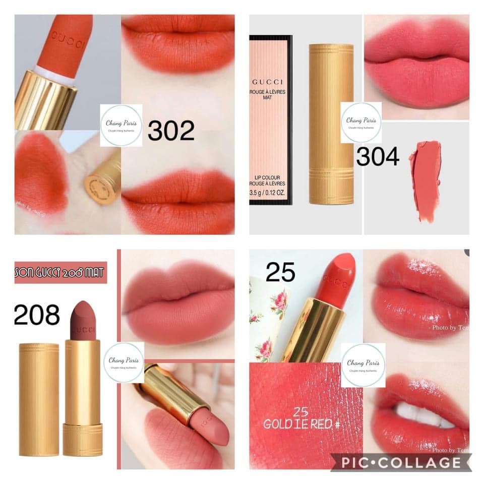Son Gucci khoác lên mình vỏ ngoài sang chảnh, tinh xảo trong từng đường chạm khắc. Sự quyến rũ không chỉ nằm ở thiết kê mãn nhãn mà còn nằm ở bảng mầu son Gucci đa dạng và thời thượng cực kỳ. 👉 Màu 25 là mầu mới của hãng với màu đỏ nữ tính đáng yêu, tông mầu trẻ trung gợi cảm hơn rất nhiêug các nàng nhé 👉 Màu 208 với mầu cam đất chuẩn tông mang đến các nàng một vẻ ngoài rạng rỡ, năng động. Màu cam đất là lựa chọn hoàn hảo xu hướng tư nhiên 👉 Màu 302 sự kết hợp sắc cam tươi tắm phù hợp cô gái phong cách dễ thương, sở hữu làn da trắng tự tin diện màu son mà k phải lo nghĩ. 👉 Màu 304 với màu cam ngọt ngào, nữ tính chất son mịn lâu trôi, không làm khô môi là món quà tuyệt vời cho các nàng