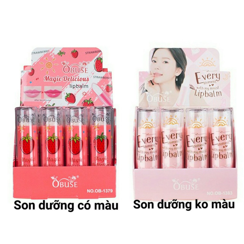 Thương hiệu: OBUSE Xuất xứ: Thái Lan Trọng lượng: 3.5g CÓ 2 LOẠI: - OBUSE My Moist Lipbalm OB1383 Một Loại Son Dưỡng Không màu - Có Hương Thơm + Mang lại đôi môi đẹp, đầy đặn với sự tự tin + Với son dưỡng đi kèm với một mùi hương ngọt ngào + Giúp nuôi dưỡng đôi môi + Có thể làm solo hoặc lớp trên lớp son môi để thêm độ ẩm trong ngày - OBUSE Magic Delicious Lipbalm OB1379: Một loại son dưỡng thay đổi màu sắc, cho độ ẩm lâu dài + Môi thâm đen không khó để giải quyết! + Với son dưỡng thay đổi màu cho độ ẩm lâu dài + Giúp điều chỉnh tình trạng da, giảm quầng thâm, thay đổi màu môi thật đẹp, hồng hào, trông thật khỏe mạnh