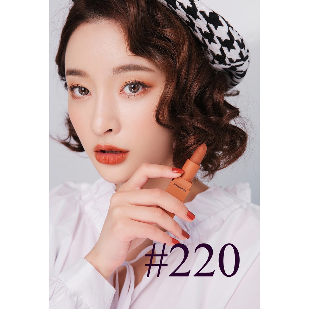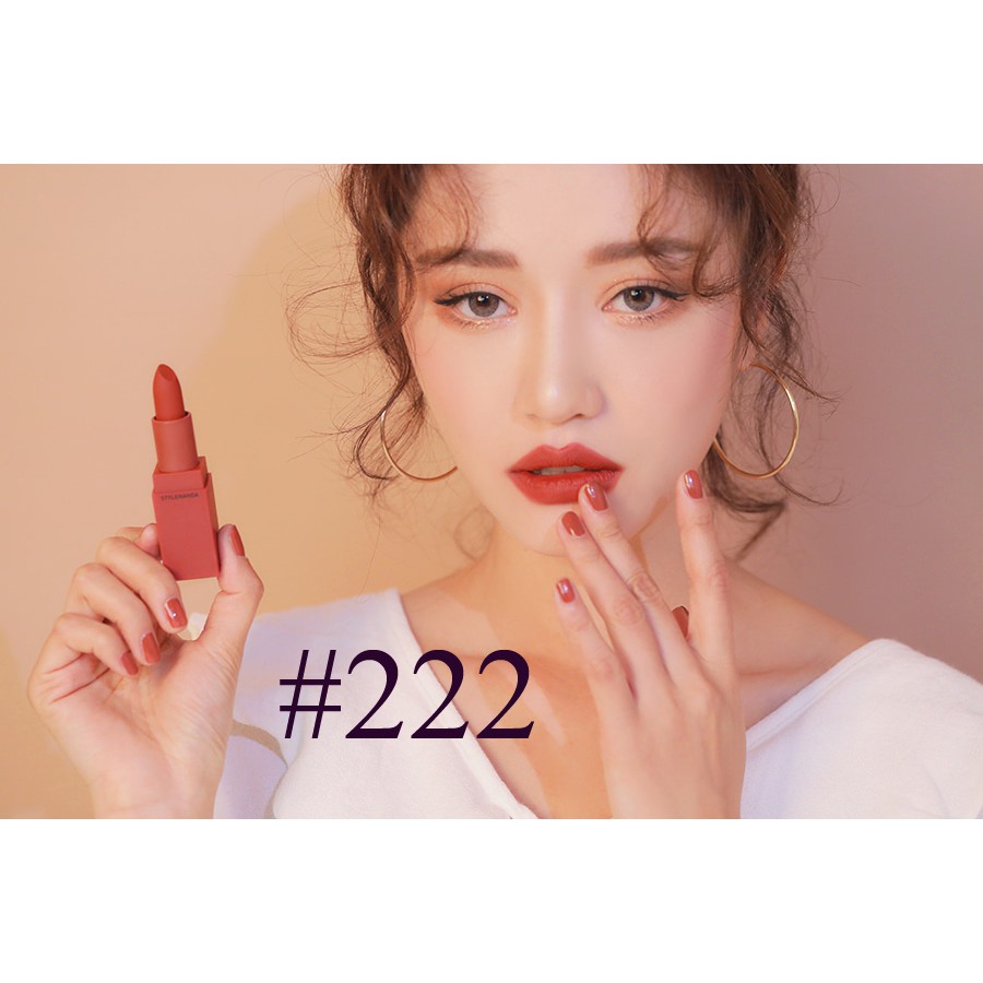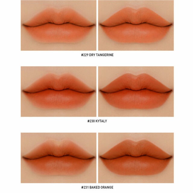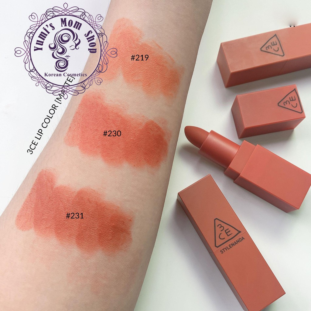 – Màu #229 – Dry Tangerine – màu vỏ quýt khô – pha đất ít nên em này tươi trẻ và năng động nhất đây – Màu #230 – Kytaly – tông đỏ gạch pha hồng xíu xiu, lên môi son nghiêng về tông ấm xinh cực kì luôn ạ – Màu #231 – Baked Orange – cam cháy pha nâu, tông son xịn mịn, sang chảnh *Son Mood Recipe 2017 vẫn giữ nguyên phong cách thiết kế trứ danh của bản Mood Recipe gốc với vỏ son cùng tông với màu son bên trong. 1. Màu #218 Mirrorlike (hồng nude) Màu #218 là sắc hồng nude khá bợt. Tuy rất "tây" nhưng màu son này sẽ đòi hỏi bạn makeup mắt kỹ một chút, nếu không da sẽ bị bợt đi đáng kể 2. Màu #219 Brilliant_ Sắc cam nude này cũng khá bợt nên các nàng cần makeup kỹ khi diện. Bù lại, khi kết hợp màu son này với màu mắt nâu cam cùng tông và kẻ mắt nước thật sắc thì kết quả sẽ cực kỳ long lanh. 3. Màu #220 Hit Me Up_ Với sắc cam đất ngả gạch với độ tươi và độ trầm vừa phải, #220 chính là một trong những màu son dễ đánh nhất của Mood Recipe 2017 và dự đoán sẽ là một trong những màu hot nhất. Màu son này gợi liên tưởng đến màu #116 trong bộ Mood Recipe 2016 nhưng có vẻ có nhiều sắc nâu đỏ hơn chút xíu._ _x000D_ 4. Màu #221 Mellow Flower Màu #221 có lẽ là một trong những gam hồng đất đẹp nhất của 3CE từ trước đến nay, không tươi quá, không trầm quá, vừa đủ và chuẩn hồng đất. Nếu bạn đang muốn tìm một màu son tự nhiên, đằm thắm phù hợp để diện hằng ngày thì nhất định đừng bỏ qua #221 Mellow Flower nhé._ 5. Màu #222 Step And Go: đỏ đất Sắc đỏ đất khá trầm nhưng lại vô cùng tôn da và phù hợp với mọi tông da. Màu son siêu dễ đánh này nhiều khả năng cũng sẽ là màu bán chạy nhất nhì trong bộ Mood Recipe 2017.