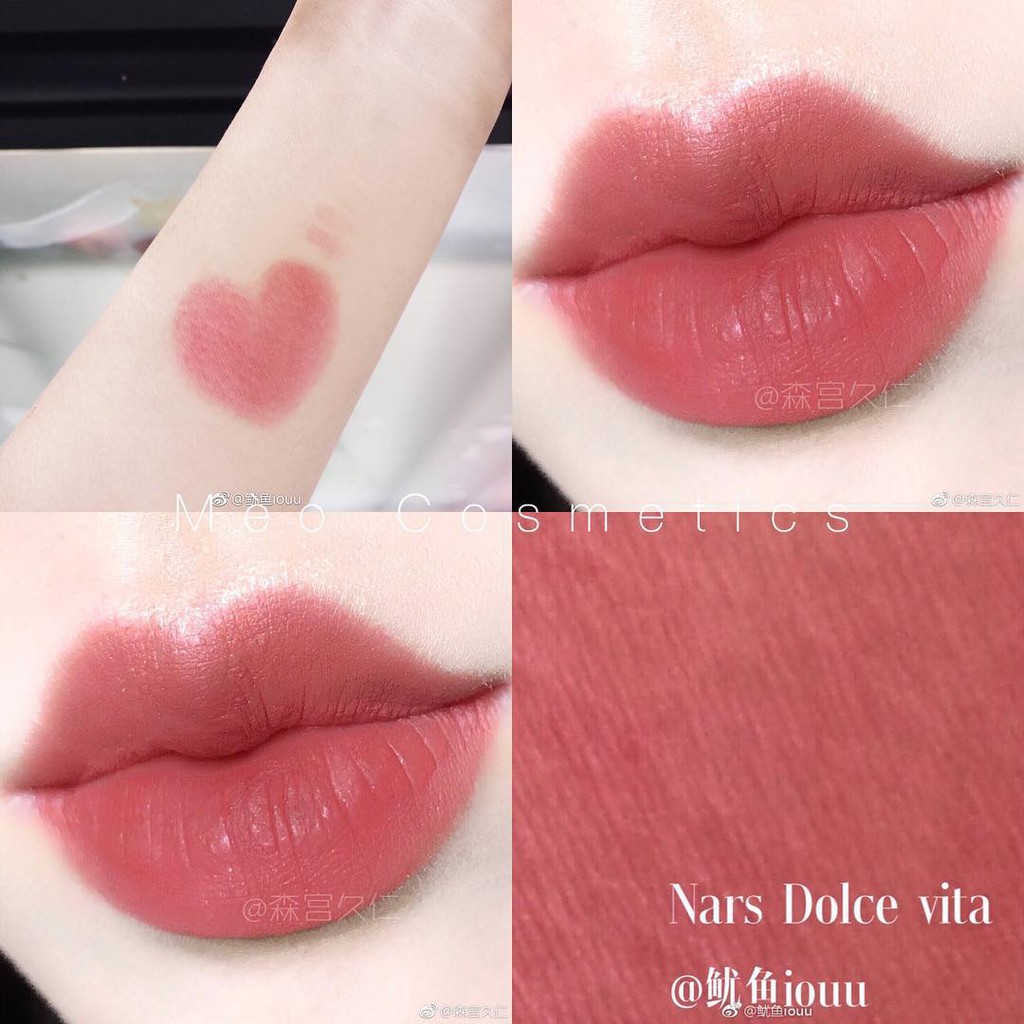 Nars Velvet Matte Lip Pencil (màu Dolce Vita): Son có thành phần giàu vitamin E và chất làm mềm giúp tạo cấu trúc cũng như làm mềm môi. Son không phải dạng lì hẳn, cũng không phải bóng. Lên môi rất dễ chịu. Fullsize: 2.4g (fullsize - $27)