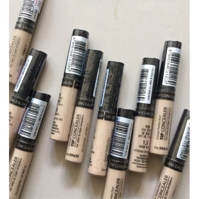 Cây che khuyết điểm này có thiết kế nhỏ xinh khoảng 10cm, vỏ bằng nhựa nắp đen chắc chắn nhưng cầm trên tay lại rất nhẹ. Mặt trước có in tên sản phẩm và chỉ số chống nắng SPF28/PA++, mặt sau in các thông tin khác bằng tiếng Hàn và tông màu. Có 3 tông màu phổ biến là no1, no1.5 và no2. Đầu cọ vát chéo nhẹ giúp việc tán sản phẩm được dễ dàng hơn.3. Công dụng The Saem Tip Concealer được biết đến với tác dụng che phủ cực tốt từ quầng thâm mắt đến các nốt thâm mụn hay vùng mụn tấy đỏ. Bên cạnh đấy, chất kem có kết cấu dạng mạng lưới giúp giữ lớp che phủ bền lâu suốt 16 tiếng đồng hồ.4. Cảm nhận Chất kem của che khuyết điểm The Saem không quá đặc, một lần lấy được khá nhiều, bạn nào da ít khuyết điểm chỉ muốn che quầng thâm mắt thì nhớ bỏ bớt lại nếu không muốn lớp kem khi apply lên bị quá dày. Chất kem này khô lại khá nhanh, nếu đã apply lên mặt mà không tán ngay dễ khiến kem khô lại gây khó tán hoặc không tiệp vào da. Khi khô để lại cảm giác khô ráo trên bề mặt, không có cảm giác dính dính khó chịu đâu.Còn về độ che phủ của cây che khuyết điểm này thì mình hoàn toàn hài lòng. Với thời tiết nóng ẩm như ở Việt Nam thì không có chuyện để được đến 16 tiếng đồng hồ đâu nhé, đến cuối ngày vẫn sẽ bị trôi bớt đi nhưng không có hiện tượng đọng lại thành các vệt.
