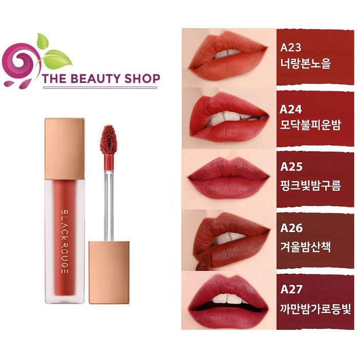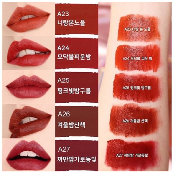 Black Rouge full swatch 5 màu son "màn đêm'' của Air Fit Velvet Tint Version 5 [Bam] A23 - #VintageSunset: Cam nude pha nâu cổ điển A24 - #CampfireNight: Cam đỏ rực rỡ A25 - #PinkPillow: Đỏ sậm ánh hồng mềm mại A26 - #WinterMoon: Nâu trầm pha cam mới lạ A27 - #Wanderlust: Đỏ nhung tông lạnh tôn da