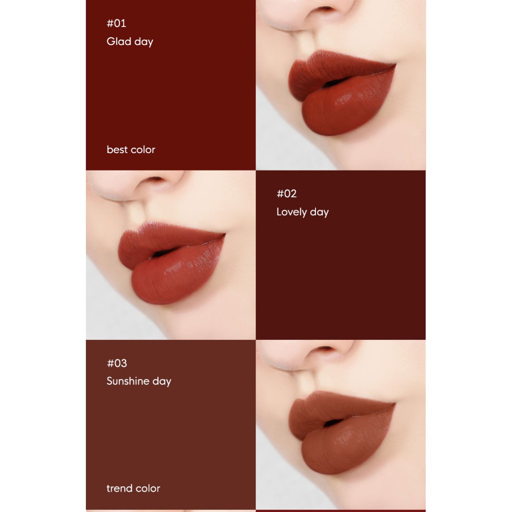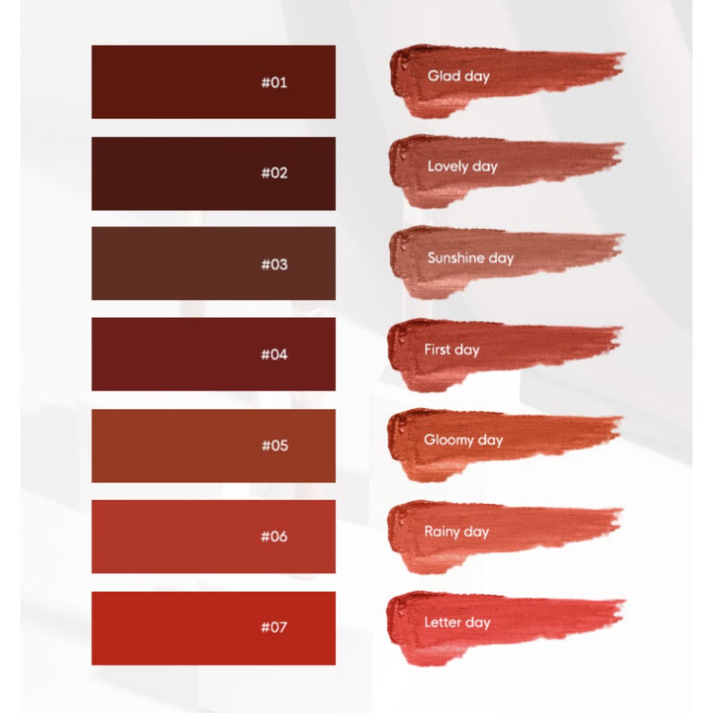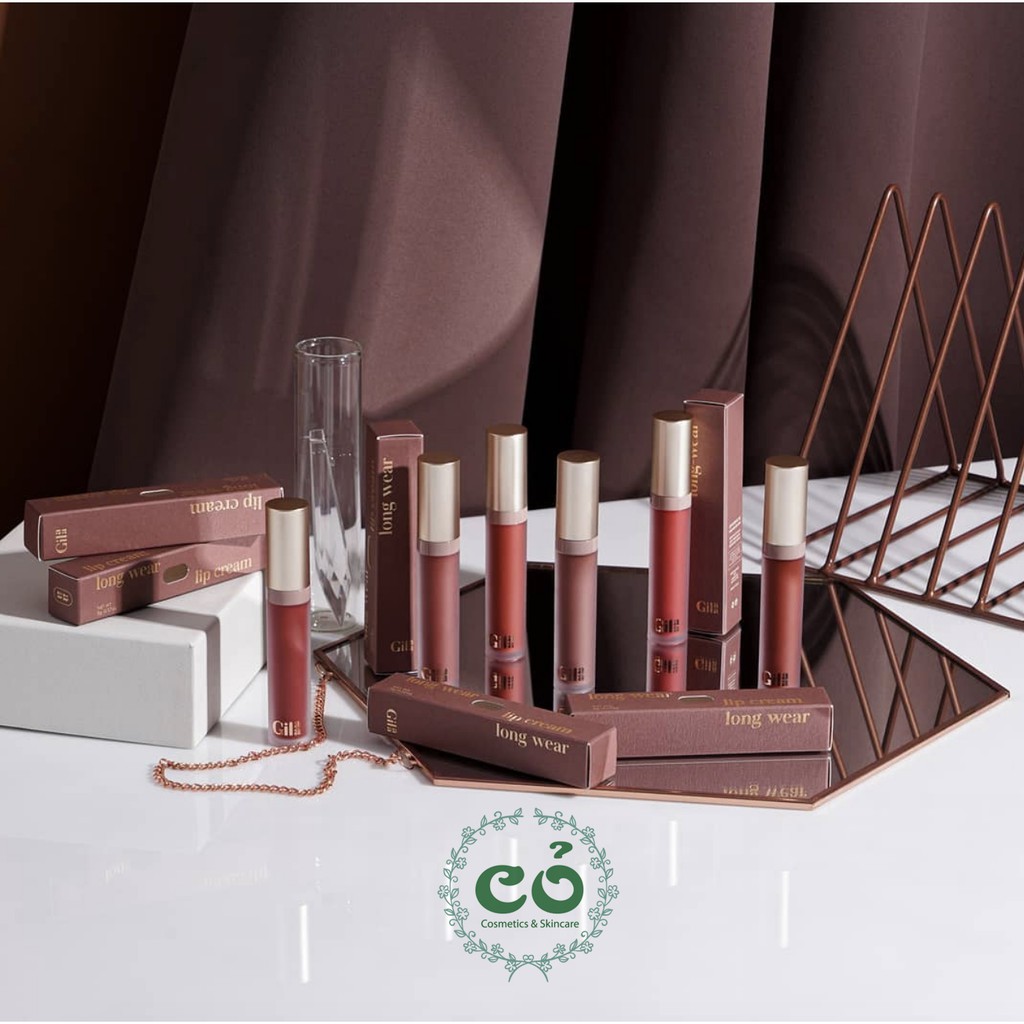 Son kem Gilaa Long Wear Lip Cream - Xuất xứ: Hàn Quốc - Thương hiệu: Gilaa cosmetics - Dung tích: 5g full size 💋Thỏi son lì dành cho những đôi môi nhiều khuyết điểm 💋 Chất kem bông xốp mềm mịn, bám chặt vào môi nhẹ như làn da thứ hai 💋 Son chuẩn màu chỉ sau một lần quẹt nhẹ, độ che phủ giúp dấu đi các khuyết điểm của môi 💋 Khả năng giữ màu 5 tiếng, chỉ trôi nhẹ khi ăn uống, để lại một lớp màu đẹp mắt 💋 Chứa bơ hạt mỡ, tinh dầu hạt mắc ca và các chất dưỡng môi, giúp môi bớt thâm khô, nứt nẻ 💋 Bảng màu bao gồm các tông từ cơ bản đến trendy. 6 tông màu tôn da, lên môi đẹp kể cả khi không make up: Màu 01: Glad Day - Đỏ Nâu - Style cá tính Màu 02: Lovely Day - Đỏ Nâu Trầm - Style quyến rũ Màu 03: Sunshine Day - Nâu Đất - Style lai tây Màu 04: First Day - Đỏ Gạch Trầm - Style ngọt ngào Màu 05: Gloomy Day - Cam Cháy - Style gợi cảm Màu 06: Rainy Day - Đỏ Cam - Style lôi cuốn Màu 07: Letter Day - Đỏ Thuần - Style tỏa sáng ------------------- 🏡 70 Nguyễn Thượng Hiền, phường 5, quận 3 (9H - 21H30) 🔸Website: http://cor.vn 🔸Facebook: Cỏ Cosmetics & Skincare 🔸Hotline: 0965528998 – 0929398899 ------------------- ♥️ Cỏ Cosmetics & Skincare 🌼 Cam kết mỹ phẩm chính hãng 100% 🌼 Luôn có giá tốt nhất