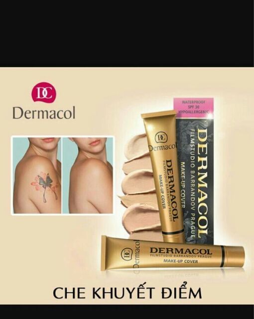 KEM CHE KHUYẾT ĐIỂM DERMACOL MAKE-UP COVER Sẵn tông 207, 210 Vừa là kem nền vừa là kem che khuyết điểm Che khuyết điểm : – Sẹo ở chân tay… – Nốt ruồi nhỏ – Vết chàm, đồi mồi, bớt ! – Khuyết điểm ở môi – Quầng thâm mắt – Nám – Mụn đỏ, mụn thâm – Tàn nhang – Hình xăm
