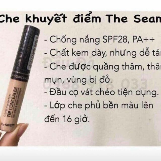 Cây che khuyết điểm này có thiết kế nhỏ xinh khoảng 10cm, vỏ bằng nhựa nắp đen chắc chắn nhưng cầm trên tay lại rất nhẹ. Mặt trước có in tên sản phẩm và chỉ số chống nắng SPF28/PA++, mặt sau in các thông tin khác bằng tiếng Hàn và tông màu. Có 3 tông màu phổ biến là no1, no1.5 và no2. Đầu cọ vát chéo nhẹ giúp việc tán sản phẩm được dễ dàng hơn.3. Công dụng The Saem Tip Concealer được biết đến với tác dụng che phủ cực tốt từ quầng thâm mắt đến các nốt thâm mụn hay vùng mụn tấy đỏ. Bên cạnh đấy, chất kem có kết cấu dạng mạng lưới giúp giữ lớp che phủ bền lâu suốt 16 tiếng đồng hồ.4. Cảm nhận Chất kem của che khuyết điểm The Saem không quá đặc, một lần lấy được khá nhiều, bạn nào da ít khuyết điểm chỉ muốn che quầng thâm mắt thì nhớ bỏ bớt lại nếu không muốn lớp kem khi apply lên bị quá dày. Chất kem này khô lại khá nhanh, nếu đã apply lên mặt mà không tán ngay dễ khiến kem khô lại gây khó tán hoặc không tiệp vào da. Khi khô để lại cảm giác khô ráo trên bề mặt, không có cảm giác dính dính khó chịu đâu.Còn về độ che phủ của cây che khuyết điểm này thì mình hoàn toàn hài lòng. Với thời tiết nóng ẩm như ở Việt Nam thì không có chuyện để được đến 16 tiếng đồng hồ đâu nhé, đến cuối ngày vẫn sẽ bị trôi bớt đi nhưng không có hiện tượng đọng lại thành các vệt.