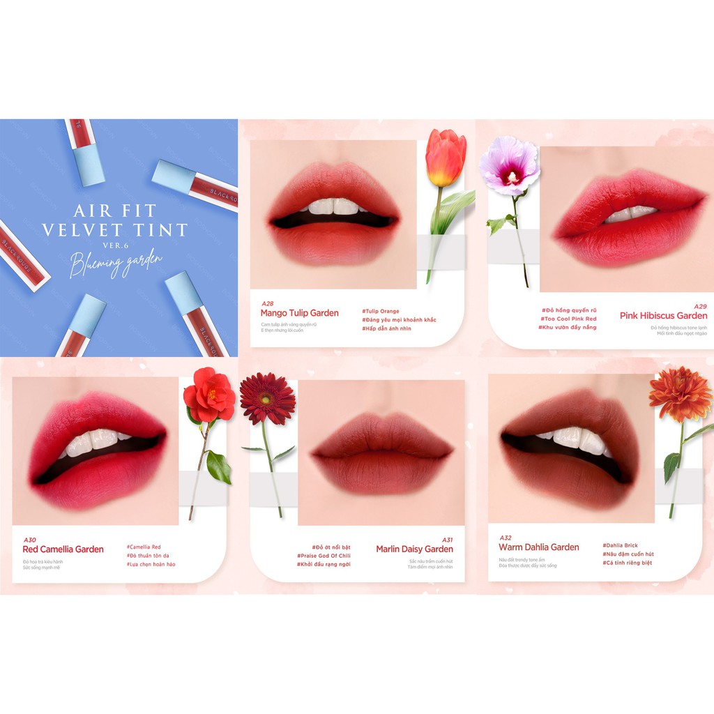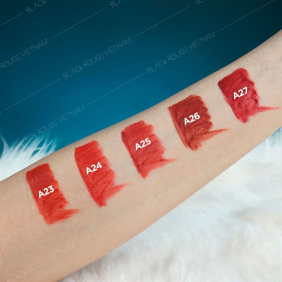 Sản phẩm Black Rouge #Ver5 với màu A23 –A27 rất siêu đẹp, tươi tắn, quyến rũ và huyền bí, đậm nét khác xa với các dòng phiên bản trước. Đây là sự cải tiến không ngừng sáng tạo về chất lượng của nhà Black Rouge để đáp lại sự kì vọng của khách hàng làm hàng đầu Khi thoa Black Rouge Air Fit Velvet Tint Ver 5: Night Series lên đôi môi với độ bám dính cao, lâu trôi bất chấp trời mưa và nước bám trên môi thì độ bám dính màu môi cực chuẩn nhé, không hề tác động đến chất lượng màu môi Bảng màu son black rough ver 5 Màu son black rouge a23 – Vintage Sunset: Cam nude pha nâu cổ điển Màu son black rouge a24 – Campfire Night: Cam đỏ rực rỡ Màu son black rouge a25 – Pink Pillow: Đỏ sậm ánh hồng mềm mại Màu son black rouge a26 – Winter Moon: Nâu trầm pha cam mới lạ Màu son black rouge a27 – Wanderlust: Đỏ nhung tông lạnh tôn da 5 tông màu son vô cùng quyến rũ hấp dẫn, huyền bí khiến cho nhiều chị em phái đẹp tha hồ mà lựa chọn để trang điểm cho đôi môi của mình nhé. - Màu sắc sẽ 5 tông màu với sự kết hợp độc đáo từ các sắc độ của 5 vườn hoa xinh đẹp sẽ giúp bạn dể dàng lựa chọn : A28 - Mango Tulip Garden: Cam tulip ánh vàng quyến rũ A29 - Pink Hibiscus Garden: Đỏ hồng hibiscus tone lạnh A30 - Red Camellia Garden: Đỏ hoa trà kiêu hãnh A31 - Dry Daisy Garden: Đỏ nâu trầm cuốn hút A32 - Warm Dahlia Garden: Nâu đất trendy tone ấm
