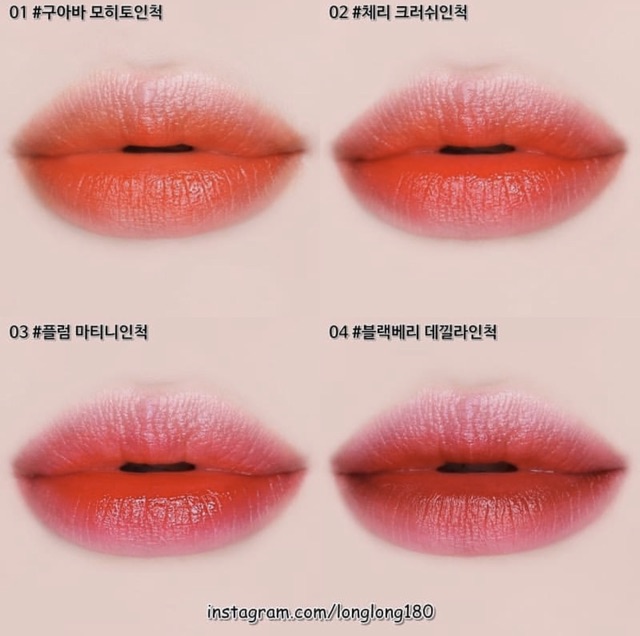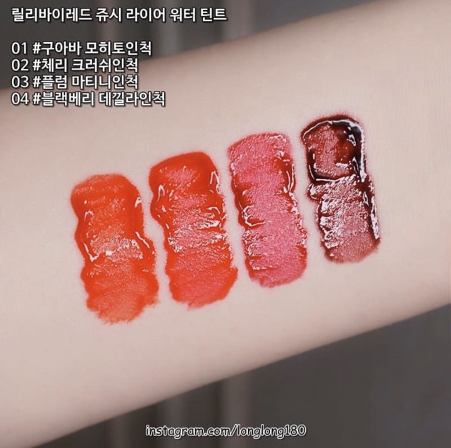 Sản phẩm son mới tint mới toanh của Lilybyred dành cho mùa hè năm nay! Đã là hè thì nhất định phải xài các loại son tint có màu sắc rực rỡ thì mới hợp nè! ▪Lilybyred Liar water tint có kết cấu đặc hơn dạng nước 1 tí, gần tương tự như gel, rất dễ tán và nhanh tiệp vào môi. ▪️Khả năng dưỡng ẩm nhờ chiết xuất thiên nhiên nên không làm khô môi ▪️Bảng màu gồm 4 màu son rực rỡ và dễ dùng, phù hợp các bạn tuổi teen, học sinh, sinh viên ▪️Mùi thơm trái cây dễ chịu ▪️Là son tint nên bám rất lâu, tha hồ ăn uống, vẫn còn giữ lại lớp base sau thời gian dài chứ ko hề bay hết. Số 1 : Cam đỏ Số 2 : Hồng cam Số 3 : Hồng đỏ Số 4 : Đỏ cherry ‼️Lưu ý : Vì là son tint nên khi apply lên môi sẽ thay đổi màu sắc 1 tí tuỳ theo sắc môi mỗi người, nên có thể không giống hoàn toàn như swatch