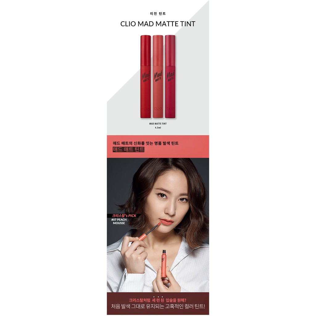 Son là một vật không thể thiếu trong túi xách của các cô nàng hiện đại ngày nay, luôn để mình rạng rỡ và xinh đẹp thì chỉ cần một thỏi son khi đi ra ngoài là đủ, không cần makeup cầu kì, chỉ cần tô son đã khiến gương mặt bừng sáng, trở nên tươi tắn. Son còn làm cho khuôn mặt trở nên ấn tượng, sắc sảo, có sức sống. Hãng mỹ phẩm nổi tiếng ở xứ sở Kim Chi, Clio đã cho ra đời một dòng sản phẩm Son Kem Lì Clio Mad Matte Tint đã lấy đi trái tim của biết bao nhiêu cô gái vì độ xinh đẹp và lên màu siêu chuẩn của nó. Công dụng : – Son Kem Lì Clio Mad Matte Tint được cải tiến công thức để có kết cấu lạ nhất trong các dòng kem lì. Khi vừa đánh lên chất son ẩm mượt và có hiệu ứng như son tint, một lúc sau khi đánh đầy môi son sẽ khô lại chuyển thành lì hoàn hảo – Son lên màu chuẩn như bất cứ dòng son kem lì nào và bám màu cực lâu. Không hề làm khô môi hay lộ rãnh môi. Các quý cô sẽ tha hồ tự tin cả một ngày dài mà không lo son bị trôi màu, lúc nào cũng rạng rỡ, xinh đẹp.