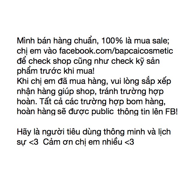 Chị em hãy tìm hiểu kỹ về shop, sản phẩm trước khi mua nhé, tớ bán hoàn toàn là hàng chính hãng nội địa Hàn Quốc, 100% mua khi hãng sale, có bill giấy/ bill chụp trên web hãng (tớ up trong ảnh sp or FB: Bắp Cải). Tiếp đó vì tớ thường lấy chuẩn ảnh swatch của hãng trên web nên chị em hãy tìm thêm ảnh trên google để có độ chính xác cao hơn nha! Các sp chính hãng, nếu có Hiddentag thì chị em có thể tải app Hiddentag về để check, ra kết quả là chính xác; còn nếu hãng đó ko có Hiddentag thì ko thể phân biệt auth fake qua check code được đâu nhé; chỉ căn cứ vào bằng chứng mua hàng của shop (bill) và sự tin tưởng của chị em với các shop mà thôi! Chị em có thể vào bất kỳ 1 diễn đàn làm đẹp uy tín nào đó để hỏi về độ chính xác của thông tin tớ đã đưa ra trên! MBC-bill Son bóng Apieu Juicy Pang Tint 4.5g Date 7/2022 Link sp: https://www.mynunc.com/product/goods/view-goods?goodsId=BO00080117&dspCateId= Chất son Juicy Pang đúng chuẩn tint - bóng, nhẹ và lên môi căng mọng như nước. 🌺Dòng son Juicy Pang Tint với thành phần từ mật ong, tinh dầu táo và tinh dầu hoa hồng nên son lên môi tạo độ bóng mướt, hiệu ứng căng mọng cho đôi môi vừa giữ cho môi mềm mại suốt nhiều tiếng đồng hồ. 🌺Bản chất của em nó vẫn là son tint nên màu lên rất rõ và rất lâu trôi, theo thời gian độ bóng sẽ giảm đi nhưng trên môi vẫn còn nguyên lớp màu stain bám dai, chỉ hết hoàn toàn khi bạn tẩy trang mà thôi. ShopMBC Shop Mẹ Bắp Cải #Shopmebapcai #sănsale Nhận order hàng Hàn và Anh (có link Hàn/Anh + giá Hàn(won)/ Anh(bảng) là mình mua được) FB: www.facebook.com/bapcaicosmetic Mình bán hàng chuẩn, chị em có thể vào www.facebook.com/bapcaicosmetic để check shop cũng như check kỹ sp trước khi mua nhé! Cảm ơn chị em nhiều <3
