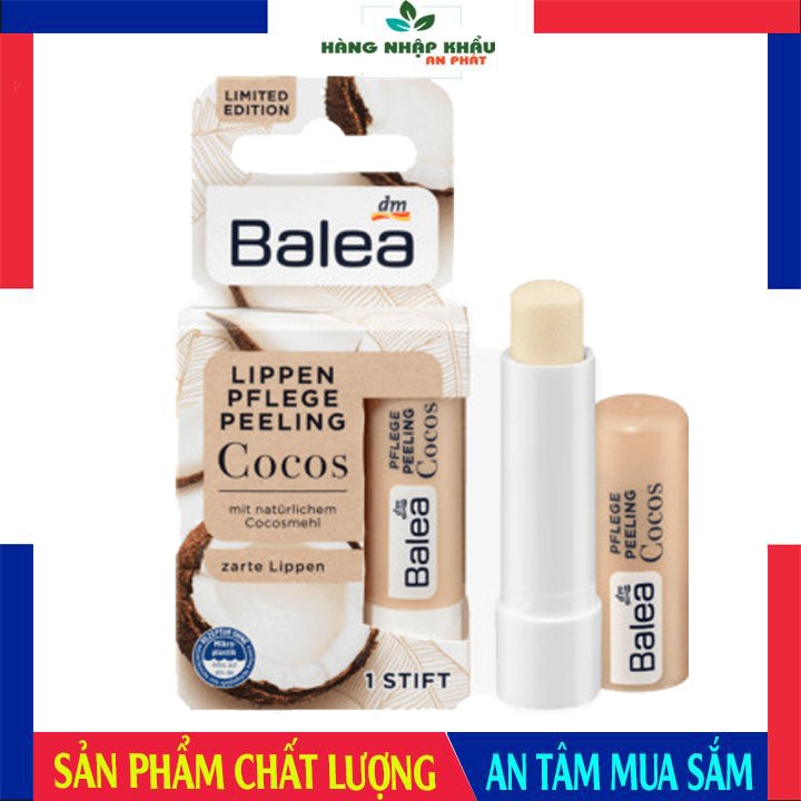 Tẩy da chết môi Balea- Hương dừa Xuất xứ : Đức Trọng lượng : 4.8g Giá : 80K -> Với thành phần chiết xuất từ bột dừa tự nhiên kết hợp cùng hạt bơ mỡ, Vitamin E và sharp ong giúp nhẹ nhàng loại bỏ da khô, da chết, da bong tróc... -> Vùa giúp tẩy da chết vừa giúp dưỡng môi đem lại cho bạn đôi môi mềm mại và mịn màng HDSD : Thoa 1 lớp dầy lên môi ,chà sát môi và massage nhẹ nhàng sau đó lau bằng bông tẩy trang hoặc khăn ướt mềm