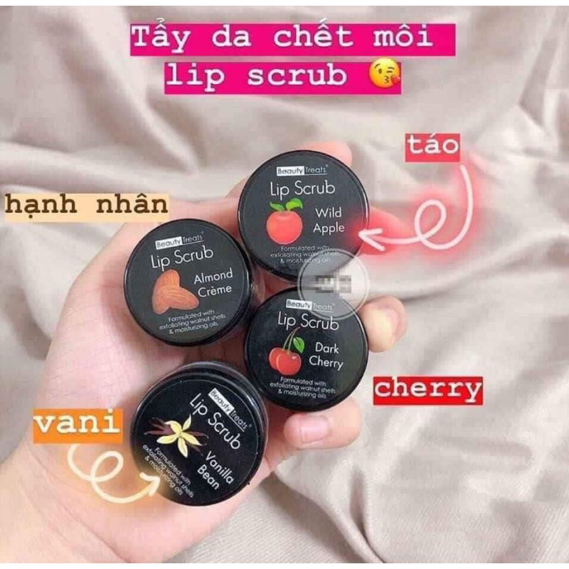 Vì sao ta phải tẩy tế bào chết cho môi? Khi môi bị khô hay sau khi ngủ dậy thì trên môi thường đọng lại những tế bào chết hay da khô trên môi cũng như xung quanh vành môi, gây mất thẩm mỹ cũng như sẽ làm cho khi ta trang điểm thì màu son không thấm đều lên môi, tạo cảm giác bị nhếch nhác. Do vậy 1 tuần khoảng 2 hay 3 lần thì chúng ta nên tẩy tế bào chết cho môi một lần để bảo vệ và tăng hiệu quả trang điểm cho đôi môi của mình BEAUTY Treats Lip Scrub chứa các tinh thể đường nâu sẽ giúp bạn loại bỏ các tế bào da chết một cách dễ dàng mà không gây kích ứng cho môi của bạn. Ngoài ra nó còn chứa các chất giữ ẩm tự nhiên như Vitamin E để ngăn mất đi độ ẩm, giúp môi mềm mượt. Beauty Treats Lip Scub tẩy tế bào chết cho môi với kết cấu dạng hạt nhỏ giúp tẩy sạch lớp da chết sần sùi hay những lớp son trang điểm còn sót lại một cách nhẹ nhàng mang đến cảm giác mịn màng, ngọt ngào cho đôi môi của bạn. Tẩy da chết Lip Scub nuôi dưỡng làn môi bằng Vitamin E, Bơ Hạt Mỡ, cùng với các thành phần chiết xuất trong quả Lê, quả Nho, hạt dầu Jojoba, và Sáp Copernicia Cerifera làm môi mềm mượt, tươi tắn và tràn đầy sức sống, mang lại cho bạn một bờ môi căng mọng lên màu son đẹp nhất có thể. Có 4 vị cho bạn lựa chọn : - Almond Creme: Hương Hạnh Nhân - Wild Apple: Hương Táo - Vanila Bean: Hương Vani - Dark Cherry: Hương Cherry Xuất xứ : Mỹ Trọng lượng : 10g