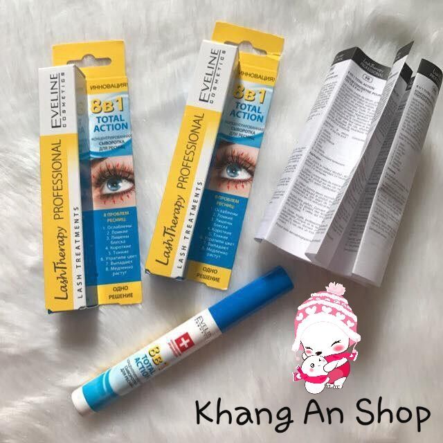 Công dụng Huyết thanh 8in1 Eveline dưỡng dài và dày mi: – Sản phẩm được đặc biệt dùng cho 8 loại lông mi khác nhau, giúp củng cố và cải thiện tình trạng lông mi. – Hãy sử dụng Eveline 8in1 Action cho 8 trường hợp lông mi sau đây: 1. Yếu 2. Giòn 3. Không có độ Bóng 4. Ngắn 5. Mỏng 6. Nhạt màu 7. Bị rụng, gẫy 8. Mọc chậm Hướng dẫn sử dụng: – Dùng như tinh chất dưỡng mi: chuốt mi từ gốc đến ngọn mi đã sạch và khô hàng ngày trước khi đi ngủ. Lưu ý: – Làm sạch vùng mặt và mắt trước khi dùng. – Ngay lập tức trên mi sẽ có màu bạc khi chuốt mi, sau vài phút khi tinh chất thẩm thấu, mi sẽ trở nên đen óng và dầy dài hơn. – Cảm giác ngứa mi mắt có thể sẽ xuất hiện ngay lần sử dụng đầu tiên vì tinh chất kích thích tế bào sản sinh. Có thể giảm số lần sử dụng đến khi hiện tượng này chấm dứt. – Sau khi sử dụng tinh chất, không dụi mắt hay rửa mắt.