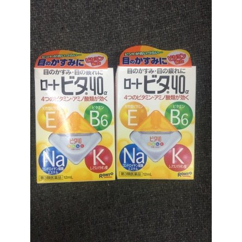 à sản phẩm bổ sung đầy đủ các loại vitamin như vitamin B6, vitamin A và E giúp phòng chống các bệnh về mắt như mỏi mắt , mờ, ngứa,đau mắt đỏ. Thuốc nhỏ mắt nhật bản của nhà sản xuất rohto còn dành cho dân văn phòng phải tiếp xúc với máy tinh và người hay đi bơi, tiếp xúc với khói bụi ngoài đường Công dụng - Hỗ trợ phòng chống các bệnh có liên quan về mắt do tác nhân bên ngoài từ môi trường như: khói bụi…hoặc những những người bị cận thị hoặc những người thường xuyên phải sử dụng máy tính nhiều. - Điều trị các bệnh về mắt như đau mắt đỏ, đau mí mắt, viêm mắt do tia cực tím hoặc những người thường xuyên sử dụng kính áp tròng… - Thuốc nhỏ mắt Rohto bổ sung 4 chất dinh dưỡng cho mắt, có hiệu của làm giảm sự khó chịu khi mắt bị mệt mỏi và mờ mắt do mắt bị mỏi. - Là loại thuốc chuyên trị các bệnh về viêm bờ mi ( viêm mí mắt), viêm kết mạc... - Sản phẩm khi dùng mang lại cảm giác dễ chịu, mát mẻ làm cho đôi mắt đang bị mệt mỏi cảm thấy tươi tỉnh và khỏe hẳn lên, đem lại một cảm giác dần dần tươi sáng. Hộp màu vàng – thuốc nhỏ mắt Rohto Vita 40:độ làm mát mắt vừa phải