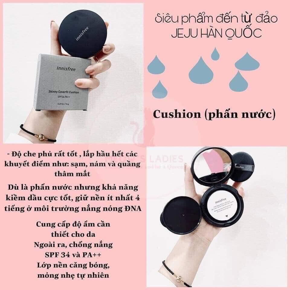 💋 Phấn nước kiềm dầu INNISFREE Hàn Quốc #NàngNào_da_dầu_tham_khảo_ngay_nha_vì_e_này_kiềm_dầu_cực_tốt. - Xuất xứ: Hàn Quốc - Thương hiệu: Innisfree - Khối lượng: 14gr - Thông tin sản phẩm: 🎉 Lõi phấn nước Innisfree Skinny Coverfit Cushion có kết cấu mỏng nhẹ giúp lớp nền trong suốt đầy tự nhiên nhờ vào công nghệ Smart Fitting vượt trội. 🎉 Sản phẩm có độ che phủ tuyệt vời giúp che lấp các khuyết điểm trên da mặt như nốt mụn, tàn nhan, lỗ chân lông,...mang lại làn da sáng, đều màu và không tì vết. 🎉 Phấn nước Innisfree Skinny Coverfit Cushion có chứa bột khoáng có khả năng kiềm dầu tốt giúp lớp phấn bám chặt vào da, giữ tone màu cực lâu từ 4 – 5 tiếng. 🎉 Ngoài ra, sản phẩm còn có chỉ số chống nắng là SPF34 / PA++ giúp bảo vệ da trước tác hại của tia cực tím hiệu quả. Giá bán : 299k