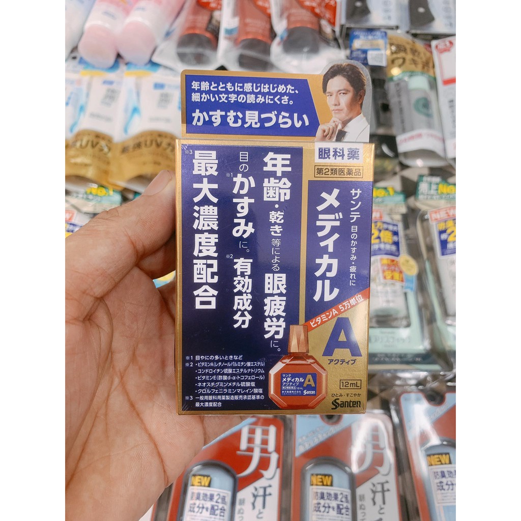 huốc nhỏ mắt Vitamin A Santen đặc trị mờ mắt, mỏi mắt, tăng huyết áp kết mạc, ngứa mắt, phòng ngừa bệnh về mắt sau khi bơi, bụi và mồ hôi vào mắt, viêm bờ mi, chống tia cực tím, giảm khó chịu khi đeo kính áp tròng... Cách dùng Nhỏ mắt Vitamin A Santen 12ml Mỗi lần nhỏ 1 - 3 giọt, 5 - 6 lần trong 1 ngày.