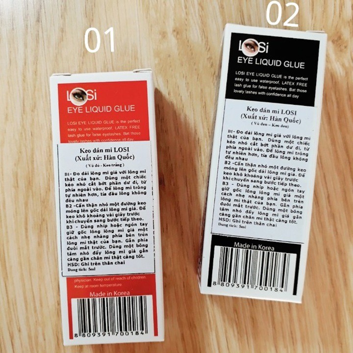 sỉ số lượng liên hệ 0949503649 dung tích : 5 ml xuất xứ : Losi, Hàn Quốc hạn sử dụng : 3 năm kể từ ngày sản xuất in trên thân lọ keo bên trong hộp lọ màu đỏ : chất keo màu trắng ( mã 01 ) lọ màu đen : chất keo màu đen ( mã 02 ) keo dán lông mi Losi là sản phẩm keo chuyên dụng dùng để dán mi giả, hàng chất ượng không gây kích ứng mắt, mùi hương thơm dễ chịu tươi mát, chất keo đặc dễ sử dụng và keo chắc có độ bám lâu đảm bảo giữ mi giả không bị bong ra khi vận động mạnh , keo dán mi Losi có 2 màu khác nhau với 2 mùi hương hoàn toàn khác nhau 1.THÀNH PHẦN : xem chi tiết trên bao bì sản phẩm 2. CÔNG DỤNG : - keo dán mi Losi dùng để dán mi giả, chất keo đặc độ dính cao đảm bảo giữ cho mi giả luôn bám chắc không dễ bị bong ngay khi bạn vận động mạnh . Ngoài ra keo dán mi Losi có hai màu keo đen và trắng với hai mùi thơm khác nhau sẽ đáp ứng nhu cầu đa dạng của bạn keo dán lông mi giả Losi hoàn toàn không gây kích ứng mắt 3. HƯỚNG DẪN CÁCH SỬ DỤNG : đo lông mi giả so với lông mi thật, dùng chiếc kéo nhỏ cắt bớt phần dư đi, tỉa đều đầu lông mi xoáy chai keo rút vòi keo ra, trải đều lớp keo lên gốc lông mi, để keo khô một lúc rồi gắn mi giả lên dùng cái nhip hoặc ngón tay giữ lông mi giả, nhẹ nhàng ấn một đầu mi giả vào mí mắt, rồi từ từ ấn tiếp nốt phần mi còn lại vào mí mắt , dùng bông tăm nhỏ đẩy lông mi vào càng gần lông mi thật cho đôi mắt thêm tự nhiên #keodanmi #keodanmigia