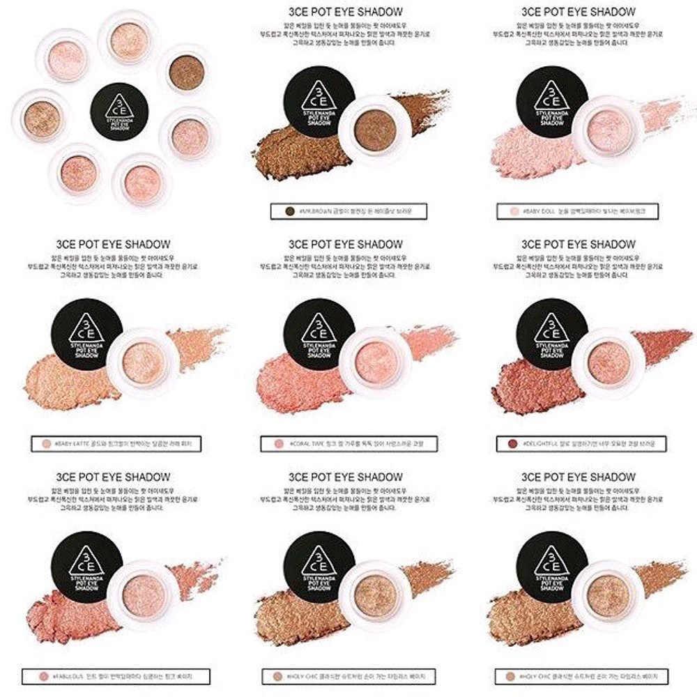 3CE POT EYE SHADOW là phấn mắt nhũ dạng sáp của thương hiệu nổi tiếng Style Nanda – 3CE, đựng trong hũ thủy tinh nhỏ xinh, bao bì đơn giản nhưng tinh tế. Chất sáp mắt nhũ mềm mịn, bám chắc mang lại hiệu quả trang điểm mắt cực cao và các màu sắc rất đáng yêu ***ƯU ĐIỂM NỔI BẬT: 3CE Pot Eye Shadow là chất sáp nhũ liên kết rất chặt với nhau tạo thành một khối, không bị rơi phấn ra ngoài. Chính vì vậy, khi sáp được tán lên mắt bám rất chặt lên da mà không bị lem nhem, rơi rớt lên má. Kết cấu dễ tán, chỉ cần tán một lần lên mắt đã có lớp màu mắt rạng rỡ và hoàn hảo mà không cần đến lần thứ hai, cũng như không cần dặm lại trong ngày. Chất sáp mắt cực kỳ mềm mịn và ẩm, lên da mềm mại như một lớp nhung mỏng, dính chặt lên da nhưng không gây nặng mắt. Điều đó làm nên sự khác biệt của 3CE Pot Eye Shadow với các sản phẩm phấn mắt khác trên thị trường, trong khi các sản phẩm khác là sự kết hợp giữa các hạt phấn nhũ với dầu làm mềm trộn lại ngẫu nhiên, còn 3CE Pot Eye Shadow được bao bọc hoàn toàn bởi dầu làm mềm, mang lại hiệu quả làm ẩm cực cao. 3CE Pot Eye Shadow chứa dày đặc các hạt nhũ, làm cho mắt lung linh rạng ngời. Với chất sáp và kết cấu nhuyễn mịn làm cho đôi mắt có chiều sâu và ánh nhìn thu hút. *** Hiện Authetic đã về đủ các màu: Delightful: nâu san hô, tạo sự bí ẩn cho đôi mắt Fabulous: màu hồng be ánh nhũ màu bạc hà rất quyến rũ Holychic: màu be cổ điển, sang trọng Baby Latte: màu đào với chất nhũ màu gold và hồng, cho mắt lung linh tự nhiên Coral Time: màu san hô rất đáng yêu ánh nhũ hồng, cho đôi mắt vẻ đẹp cuốn hút