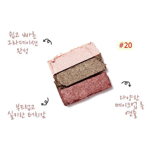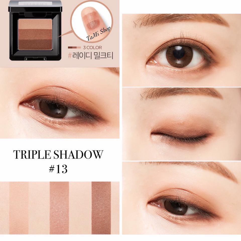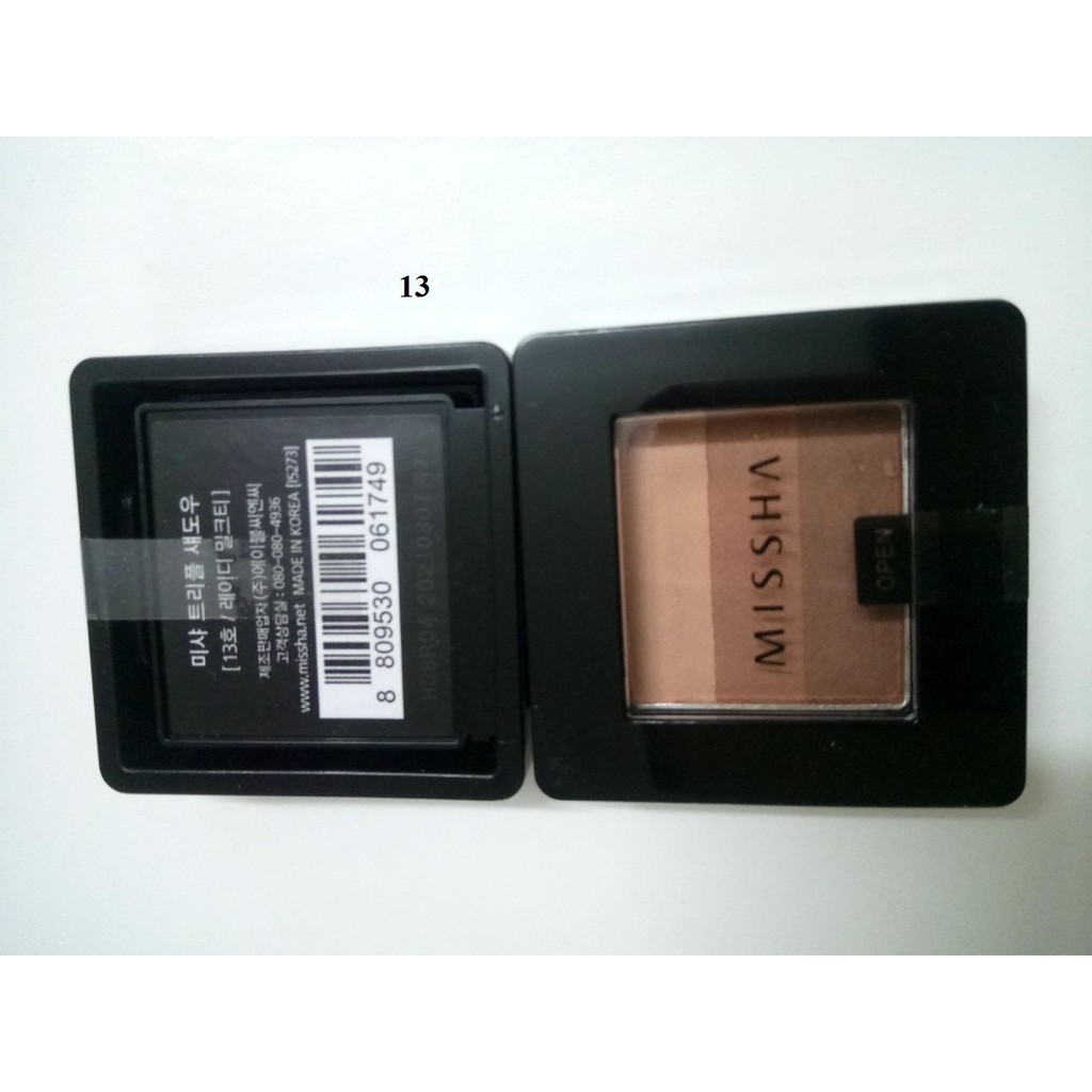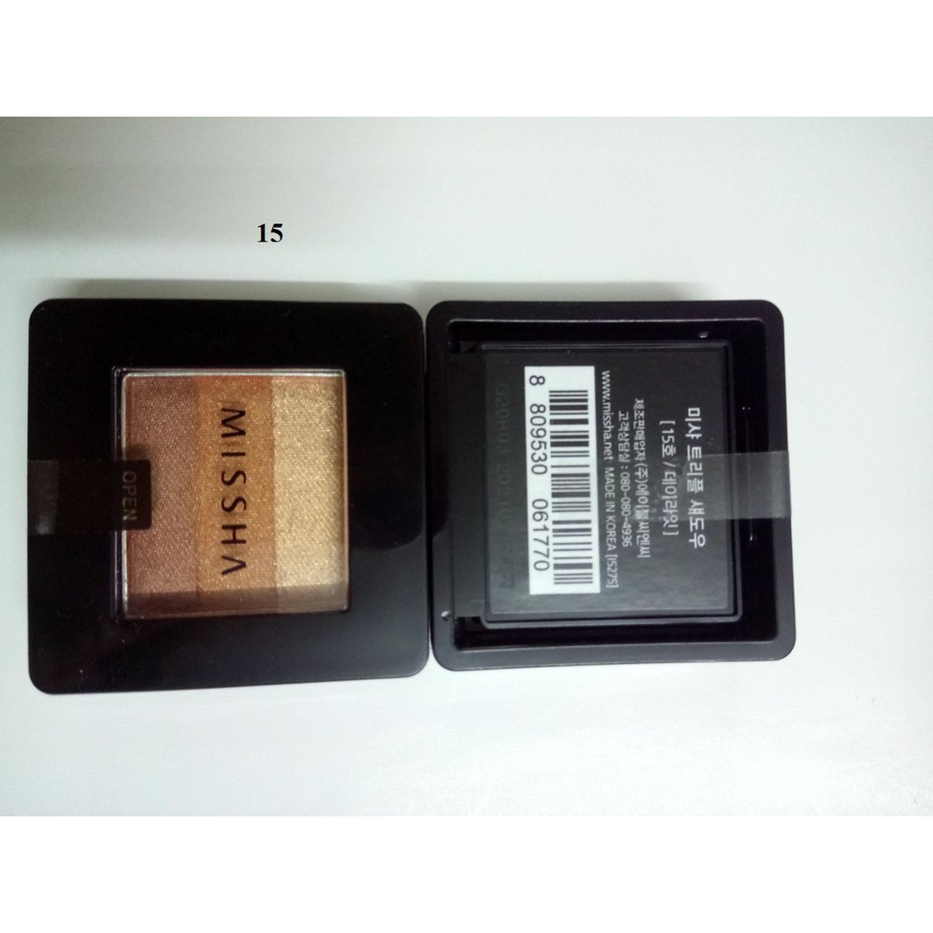 Phấn mắt Misha về sẵn toàn màu đẹp ce ơi 😗 Em có sẵn mầu 13-15-16 nha khách. Phấn Mắt Missha với 3 ô màu trang điểm mắt hoàn hảo mang đến vẻ mềm mại và tự nhiên cho đôi mắt. 🌸 Kích cỡ nhỏ gọn cùng màu sắc phong phú kết hợp với ánh nhũ lấp lánh của ngọc trai mang lại ánh nhìn tuyệt vời cho đôi mắt. 🌸Thành phần an toàn không gây hại và kích ứng cho mắt. 🌸 Màu sắc bền đẹp, lâu trôi. 🌸 Hộp tiện dụng với 3 ô màu: 1 màu sáng nhất làm màu nền, 1 màu chính đánh bầu mắt và một màu nhấn giúp đôi mắt sâu và cuốn hút hơn 🌸 còn có thể dùng màu sáng trong hộp làm phấn highlight tôn đường nét khuôn mặt Và màu tối không nhũ làm phấn tạo khối nữa nhé khách.