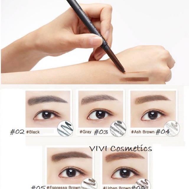 Chì kẻ mày Innisfree Auto Eyebrow Pencil mẫu mới 2019 với thiết kế 2 đầu thông minh sẽ là trợ thủ đắc lực trong việc định hình và tạo dáng chân mày, cực kỳ dễ thao tác cho dù bạn mới tập tành hay đã là cao thủ make up. Đầu chì hình oval giúp bạn định hình và kẻ chân mày theo ý thích, đặc biệt là kiểu lông mày ngang trẻ trung và năng động đang hot tại Hàn Quốc. Thiết kế dạng vặn cực kỳ tiện lợi, không cần phải gọt đầu chì như các loại chì kẻ mày thông thường, có nắp giúp bảo vệ chì không bị gãy. Kết cấu chì mềm mại nhưng bền màu, không sợ bị lem trôi khi bạn ra nhiều mồ hôi. Đầu còn lại là cọ chải mày, có chức năng tán đều màu, giúp đường kẻ mềm mại, tự nhiên và sắc nét sau khi bạn vẽ chân mày đồng thời khiến các sợi lông mày vào nếp gọn gàng. Đầu cọ được thiết kế xoắn, cứng cáp nhưng không hề làm tổn thương da và làm rụng lông mày. Hướng dẫn sử dụng Bước 1: Dùng đầu cọ kẻ lông mày Innisfree , kẻ men theo đường từ đầu lông mày cho đến đỉnh mày khoảng 2/3 chân mày Bước 2: Từ đỉnh lông mày tiếp tục kẻ cho đến hết chân mày (1/3 còn lại) Bước 3: Dùng bút chì nâu kẻ dài lại từ đầu chân lông mày cho đến cuối chân mày. Bước 4: Dùng đầu chuốt lông mày chuốt từ từ đều theo chiều lông mày để tông mày kẻ được đều đặn và tự nhiên hơn. 01 (Rose Brown): Nâu nhạt 02 (Black): Đen 03 (Gray): Xám 04 (Ash Brown): Xám nâu 05 (Espresso Brown): Nâu đen 06 (Urban Brown): Nâu sáng 07 (Honey Brown): Nâu vàng