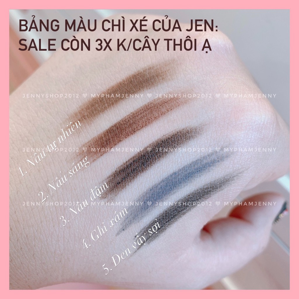 Chì Xé Kẻ Chân Mày Chất chì đanh, độ cứng mềm vừa phải, đi màu dễ dàng, mịn đều, lên màu chuẩn xác từng nét kẻ. Ruột chì to, có thể để nguyên và dùng, hoặc dùng dao gọt bớt đầu chì thành dạng dẹp, nhọn tuỳ ý thích. Kẻ được tất cả các kiểu lông mày, từ mày mịn kiểu bột đến lông mày gẩy sợi điêu khắc Bảng màu gồm 5 màu lựa chọn: 1 - Nâu tự nhiên 2 - Nâu sáng 3 - Nâu đậm 4 - Ghi xám 5 - Đen