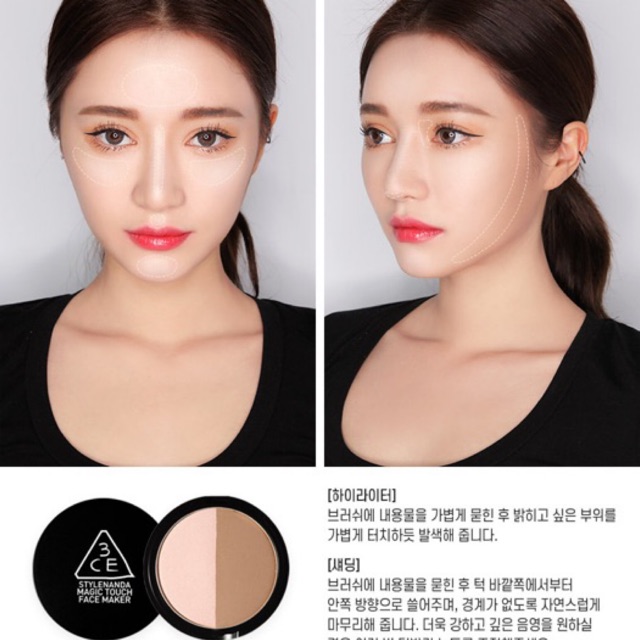 Phấn tạo khối 3CE Magic Touch Face Maker là phấn highlight và shading, dạng phấn tạo khối, tạo điểm sáng cho khuôn mặt được tích hợp cùng 1 sản phẩm tiện lợi và dễ sử dụng. Đặc biệt, sản phẩm với thiết kế chuyên nghiệp, sang trọng, đậm chất Hãng 3CE. Phấn highlight (phần sáng) giúp bắt sáng tốt, gương măt thêm phần điểm nhấn,, tạo sức sống và sự tươi trẻ cho gương mặt, tạo sống mũi, 2 gò má, che khuyết điểm thâm quầng mắt. Shading- tạo khối(phần tối) cho khuôn mặt như vùng trán gần chân tóc, 2 bên sống mũi, mang tai tới xương hàm,…. Phấn tạo khối giúp cho khuôn mặt thon gọn hơn, có chiều sâu và sắc nét, thanh thoát hơn. Phấn tạo khối 3CE Magic Touch Face Maker tạo điểm sáng trên khuôn mặt như dọc sống mũi, trán, cằm, gò má, xương chân mày (dưới đuôi chân mày) giúp gương mặt căng và đầy đặn hơn. Tạo hiệu ứng sống mũi, trán, gò má cao và đầy đặn hơn.
