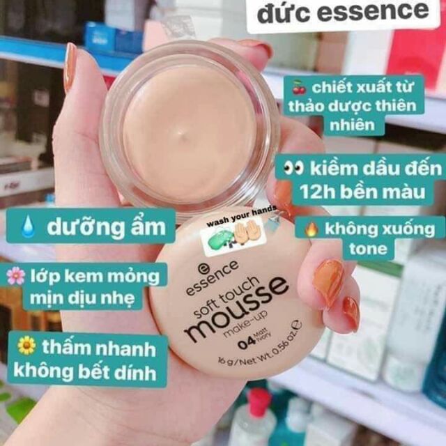 Phấn tươi essence soft touch mousse 16g – Đức Xuất xứ: Hàng xách tay Đức Hãng sản xuất: Germany Trọng lượng: 16gr Giá : 145k – Công dụng và độ che phủ “thần thánh”: Với thành phần không chì, chiết xuất hiệu quả cao từ nguyên liệu tươi và không chứa chất bảo quản, bên cạnh công dụng chính là tạo lớp nền khi trang điểm, phấn tươi Essence soft touch mousse make-up còn có khả năng dưỡng da giữ ẩm và kiềm dầu vô cùng hiệu quả chỉ với một lớp phấn siêu mỏng nhẹ. – Có khả năng kiềm dầu từ 8h-12h là dạng mousse khi đánh không bị bết dính như các loại kem BB, CC thông thường. Không cần thiết phải phủ thêm phấn bột nếu make-up kiểu nhẹ nhàng. Thích hợp cho mọi loại da đặc biệt là da dầu.