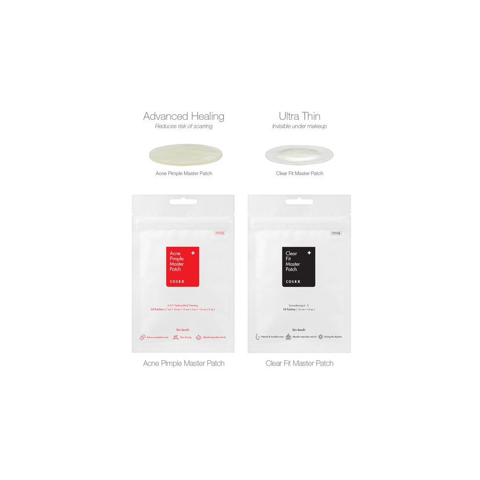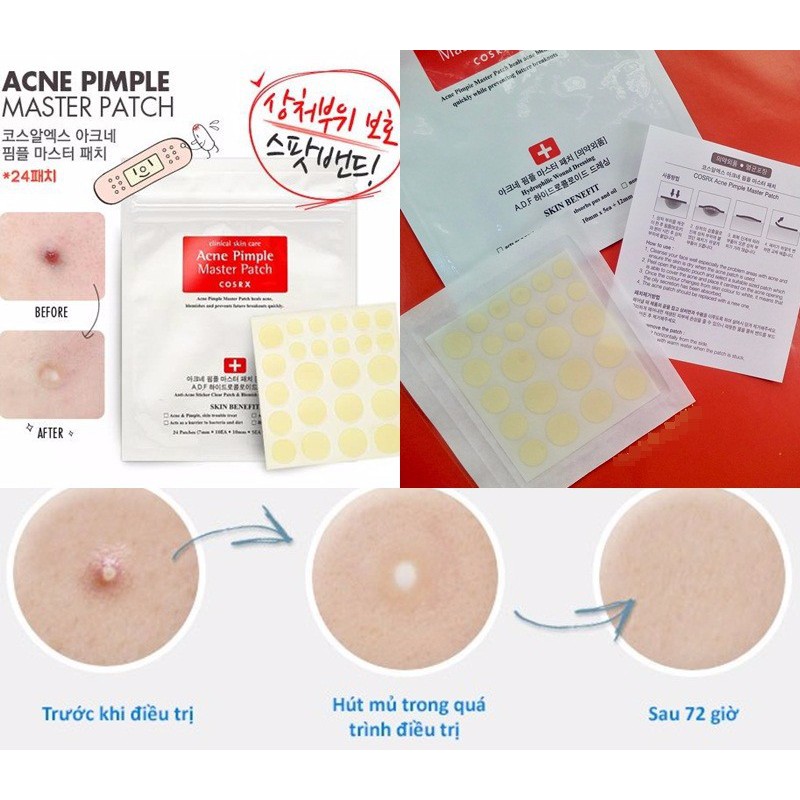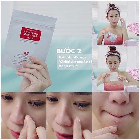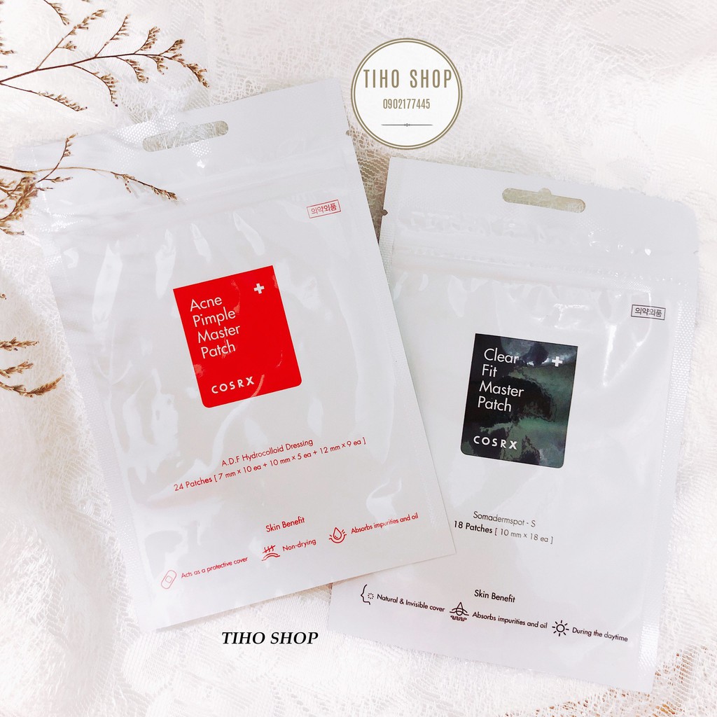 Tiho Shop chỉ bán duy nhất hàng chính hãng - Ảnh thật shop tự chụp - Hotline 0902 177 445 ============================== Xuất xứ: Hàn Quốc Thương hiệu: Cosrx Quy cách: 1 gói 24 miếng nhiều kích cỡ khác nhau - Với công nghệ hydroccoloid, miếng dán Cosrx Master Patch sẽ nhanh chóng hút nhân mụn và xoa dịu làn da bị tổn thương. Thay miếng dán sau mỗi 12 giờ hoặc khi miếng dán chuyển sang màu trắng. Tiếp tục sử dụng miếng dán cho đến khi vết thương hoàn toàn hồi phục. - Ngay khi vừa dán dính lên da, miếng dán mụn sẽ nhanh chóng hấp thu mủ mụn đồng thời bảo vệ vết thương một cách hiệu quả. Ngăn ngừa bụi bặm. Hạn chế sẹo thâm do mụn để lại. Đặc biệt, miếng dán siêu mỏng sẽ khiến mụn “biến mất” ngay lập tức. Trả lại vẻ xinh tươi cho bạn gái. 1. Acne Pimple Master Patch (đỏ) : khá dày, một gói có nhiều kích cỡ cho mọi loại mụn. 2.Clear Fit Master Patch (đen) : mỏng hơn, ít bị lộ, có thể dán trước lớp make up mà ko lo ảnh hưởng vết mụn và ko bị lộ vết mụn nha, chỉ có 1 kích cỡ.