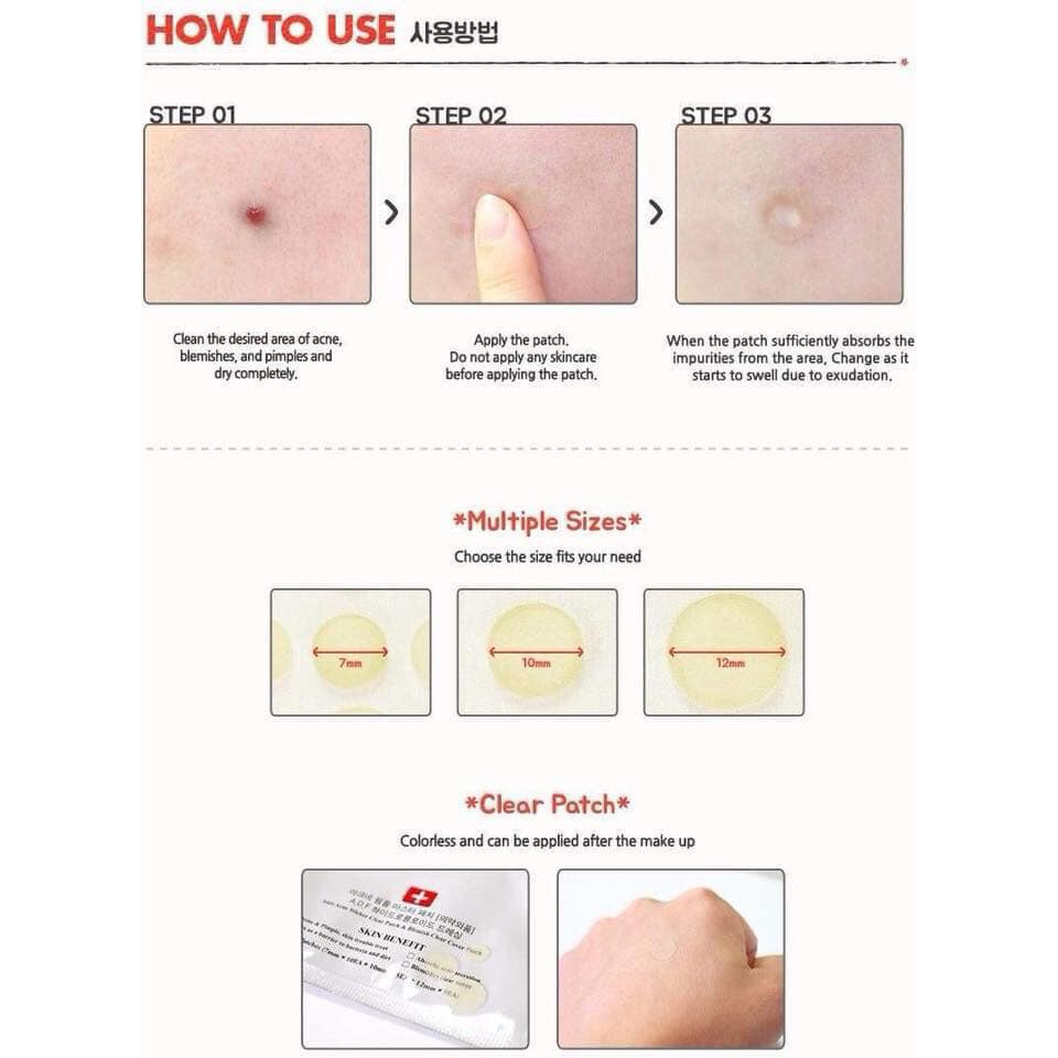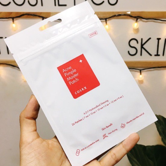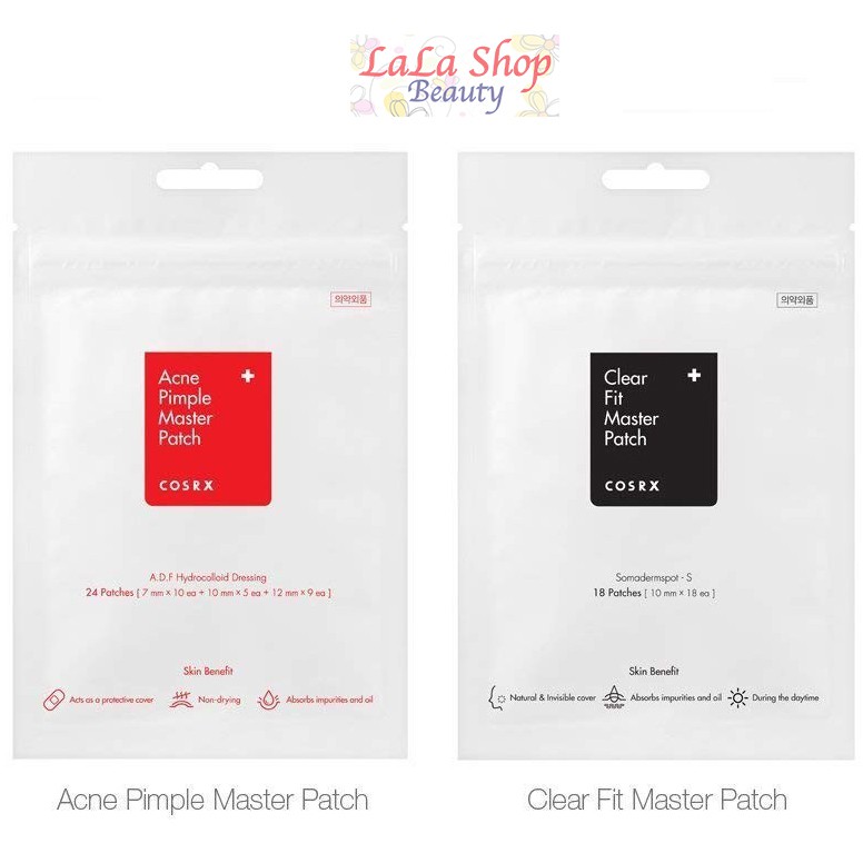 Miếng Dán Mụn Cosrx Acne Pimple Master Patch - Thương hiệu: Cosrx - Xuất xứ: Hàn Quốc Miếng dán mụn giúp che đi và bảo vệ các đốm mụn, vết sưng hoàn hảo. Mang đến làn da vẻ đẹp không tì vết tự nhiên. Sản phẩm hấp thụ các dịch mủ và dầu thừa từ vùng bị viêm xung quanh nhân mụn. ++ Có 2 loại: - Acne Pimple Master Patch (COSRX ĐỎ): gồm 24 miếng dán với nhiều kích cỡ cho các nốt mụn to nhỏ khác nhau. - Clear Fit Master Patch (COSRX ĐEN): gồm 18 miếng dán cùng 1 kích cỡ giống nhau. Miếng dán mỏng hơn, ít bị lộ, có thể dán trước lớp make up mà ko lo ảnh hưởng vết mụn và ko bị lộ vết mụn. ++ Đặc điểm cà công dụng: - Miếng dán Cosrx Acne Pimple Master Patch Đỏ có nhiều kích thước khác nhau nên có thể sử dụng trên nhiều vùng mụn to hoặc nhỏ. Đồng thời khả năng hút mủ và giảm sưng mụn của sản phẩm này cũng cao hơn. - Miếng dán Cosrx Clear Fit Master Patch Đen ngoài khả năng hút mủ, còn có khả năng che phủ nốt mụn nhờ thiết kế lan màu và độ dày siêu mỏng. Nếu sử dụng miếng dán và trang điểm đè lên thì rất khó để thấy nốt mụn. - Với công nghệ hydroccoloid, miếng dán Cosrx acne Pimple Master Patch sẽ nhanh chóng hút nhân mụn và xoa dịu làn da bị tổn thương. – Miếng dán như một lớp mặt nạ, ngăn cách giữa mụn và môi trường, sẽ ngăn ngừa việc bụi bẩn ô nhiễm hay vi khuẩn tiếp tục tiếp xúc với mụn, khiến mụn ngày càng sưng to hơn. ++ Hướng dẫn sử dụng: - Rửa sạch mặt và tay trước khi sử dụng - Chọn miếng dán phù hợp size mụn. Nhẹ nhàng dán lên nốt mụn - Thay miếng dán sau mỗi 12 giờ hoặc khi miếng dán chuyển sang màu trắng.