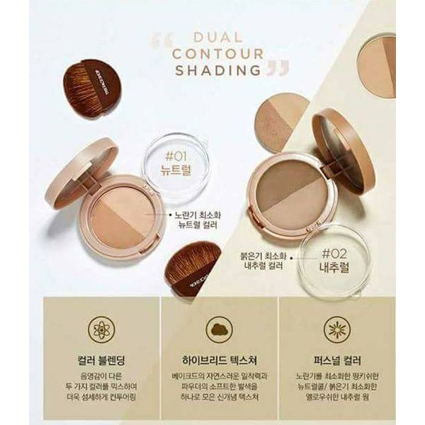 Phấn tạo khối Dual Contour Double Contour Xuất xứ: Hàn Quốc Trọng lượng: 7g Mô tả sản phẩm: - Phấn tạo khối Dual Contour Double Contour là sản phẩm phấn tạo khối tiện lợi giúp tạo đường nét thon gọn cho gương mặt. - Phấn Dual Contour Double Contour kết hợp 2 tone màu đậm – nhạt giúp người dùng linh hoạt trong việc tạo nét gương mặt tinh tế hơn. - Hạt phấn bám da lâu và rất tự nhiên, hoàn toàn không lộ dấu phấn. Có thể sử dụng hằng ngày, trang điểm nhẹ nhàng cũng rất phù hợp. - Phấn phù hợp cho cả những bạn mới tập make up cũng dễ dàng có được khuôn mặt tạo khối hoàn hảo như make up chuyên nghiệp. - Tạo khối Dual Contour Double Contour có 2 tone màu để bạn có đa dạng sự lựa chọn, giúp linh hoạt chọn được phấn phù hợp với tone da của mình: + 01: Neutral + 02: Natural Cách sử dụng: - Màu nâu đậm: dùng đánh vùng 2 bên cạnh hàm và vùng viền trán. - Màu nâu nhạt: dùng đánh 2 bên sống mũi và xương gò má.Phấn tạo khối Dual Contour Double Contour.
