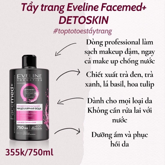 Thông tin sản phẩm: - Nước Tẩy Trang Panaderma Eau Micellaire 500Ml là sản phẩm đến từ thương hiệu mỹ phẩm Panaderma, không chỉ giá bình dân mà công dụng của sản phẩm vô cùng tuyệt vời đã làm mưa làm gió các bạn trẻ không ngừng nghỉ tìm kiếm. Với chai khổng lồ 500ml chứa thành phần nước khoáng giúp tẩy sạch các chất bẩn và bã nhờn sâu trong lỗ chân lông cùng lớp trang điểm trên da, giúp da luôn sạch thoáng mịn màng cung cấp dưỡng chất cho da và ngăn ngừa mụn xuất hiện. Nước Tẩy Trang Panaderma Eau Micellaire 500 Ml có 3 dòng: Nước Tẩy Trang Micellaire Panaderma Eau/De Bleuet – Hương Việt Quất – Màu Xanh: Cleanes, removes make-up & tones Công dụng: - Giúp làm sạch và loại bỏ tạp chất bẩn tích tụ trong làn da của bạn sau một ngày dài và giúp phục hồi làn da tự nhiên làm dịu nhẹ làn da. - Sử dụng cho mọi loại da, da hỗn hợp Nước Tẩy Trang Micellaire Panaderma Eau/De Rose – Hương Hoa Hồng Pháp – Màu Hồng: Cleanes, removes make-up & soothes - Giúp làm sạch và loại bỏ tạp chất bẩn tích tụ trong làn da của bạn sau một ngày dài tẩy sạch và xóa bụi bẩn và những lớp trang điểm dày làm da diu nhẹ. - Sử dụng phù hợp cho da nhạy cảm. Nước Tẩy Trang Micellaire Panaderma/Aloé Vera – Hương Lô Hội – Màu Đỏ : Cleanes, removes make-up & hydrate Công dụng: - Làm sạch và loại bỏ tạp chất bẩn tích tụ trong da của bạn sau một ngày dài tẩy sạch và xóa bụi bẩn và tăng độ ẩm cho da. - Chống oxi hóa. - Sử dụng phù hợp cho loại da khô. Hướng dẫn sử dụng: - Bước 1: Đổ một Lượng nước tẩy trang vừa đủ thích hợp cho ra bông tẩy trang. - Bước 2: Nhẹ nhàng làm sạch các vùng da nên chú í các vùng như cánh mũi và dưới môi. - Để đạt hiệu quả cao nhất cho việc tẩy trang mắt môi, bạn nên ấn nhẹ nhàng 2 chiếc bông tẩy trang lên vùng mắt, để trong khoảng 10 giây và sau đó lau theo chiều từ trên xuống.