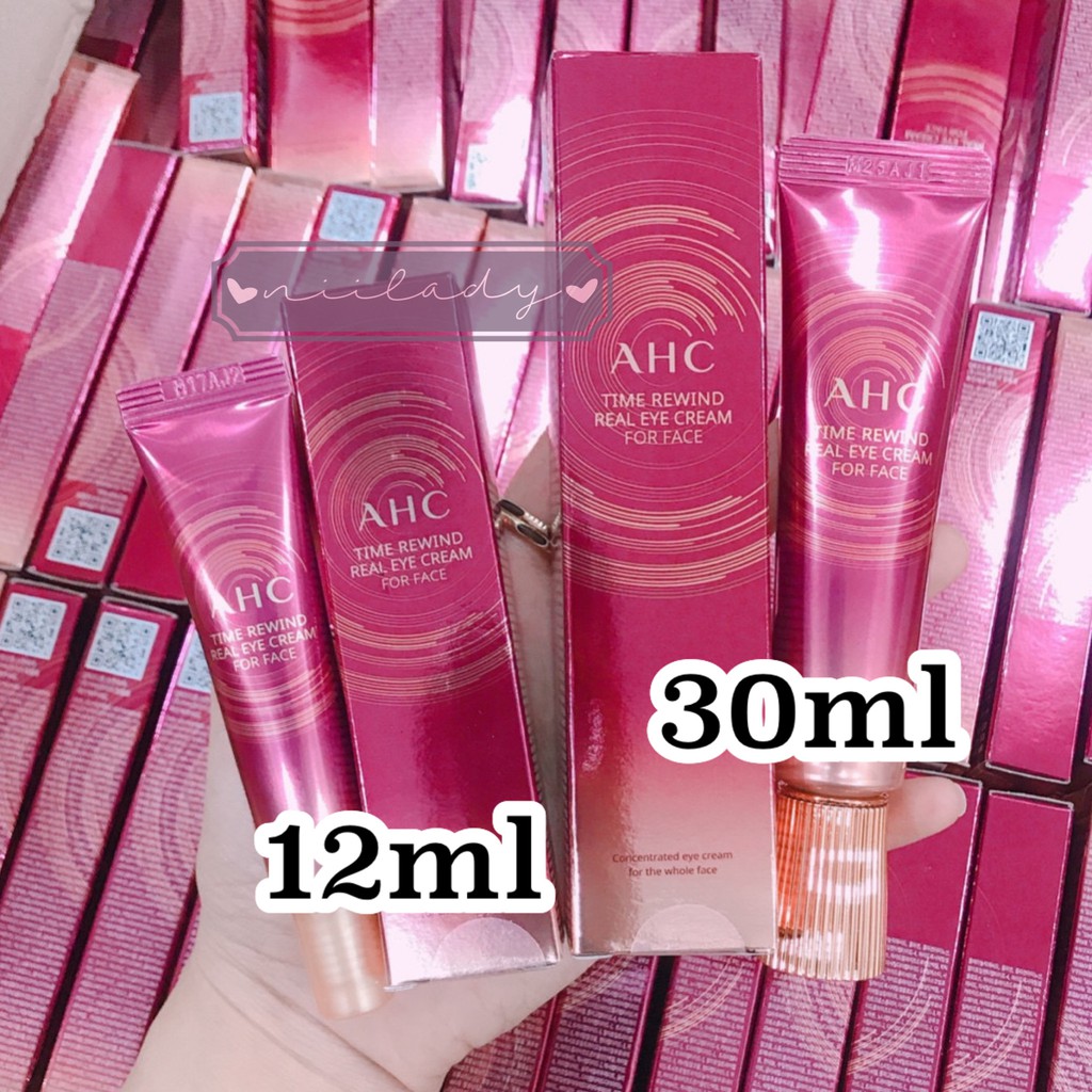 Từ bản AGELESS đến TIME REWIND không có quá nhiều khác biệt, công dụng mang lại cũng giống nhau, Nii xem vài review mọi người bảo cảm quan TIME REWIND thấm nhanh hơn AGELESS xíu xiu Mọi người dùng có cảm thấy như thế nào đừng ngại gì hãy để lại đánh giá cho shop cùng các bạn khác tham khảo nha. Cám ơn mọi người rất nhiều❤️ _________ 🍃Kem Chống Nhăn Trị Thâm Quầng Mắt AHC là sản phẩm chăm sóc riêng biệt dùng cho vùng mắt bán chạy nhất tại Hàn Quốc. Điều đặc biệt làm nên sự thành công của hãng là tính chuyên nghiệp, chất lượng đi cùng với hiệu quả. Kem Mắt AHC Private Real Eye Cream For Face đem đến người dùng sự tiện lợi: vừa là kem dưỡng vùng mắt vừa là kem dưỡng cho vùng da mặt (nếu thích) 🍃Dòng sản phẩm AHC ‘s’ The Real Eye Cream for face’ của AHC đã giành vị trí đầu bảng trong thị trường kem mắt Hàn Quốc với tổng số 47.3% thị phần tại các kênh bán hàng khác nhau bao gồm shopping qua truyền hình, các cửa hàng miễn thuế, cửa hàng mỹ phẩm, internet và các multi – brand shop. 🍃Các nữ diễn viên hàng đầu Hàn Quốc như Kim Hye-soo, Kang So-ra và Lee Bo-young là những người mẫu đại diện của A.H.C. Và gần đây, nữ diễn viên hàng đầu của Hollywood “Anne Hathaway” đã được chọn làm đại sứ thương hiệu của A.H.C trên toàn cầu. 🍃Thành phần chính: - Gồm các lupin protein và argireline - Chứa nhiều loại Peptide giúp ngăn ngừa, chống lão hóa da và săn mịn da - Chứa Niacinamide, Bifida, Glutathione làm trắng sáng da hữu hiệu - Chứa Collagen, Shea Butter, Ceramide... tăng độ đàn hồi, căng bóng da - Chứa Antitoxin, Sodium Hyaluronate... chống mất nước, giữ ẩm làn da - Chiết xuất centella, protein sữa cùng các loại nấm, rễ cây quý ngăn ngừa và điều trị các tổn thương da 🍃Công dụng: - Chống lão hóa da - Ngăn ngừa nếp nhăn nhỏ và giảm các nếp nhăn sâu - Da đàn hồi, săn chắc - Sáng mịn, căng bóng da - Chống thâm quầng, làm sáng da - Dưỡng ẩm và chống mất nước da