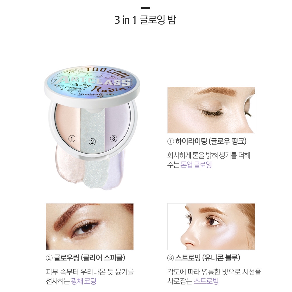 Artclass By Rodin Lumineuse Varnish is a luminous balm palette comprised of three different shades of glowing and highlighting balms for the ultimate dewy-looking skin. How to use 1. Apply Clear Sparkle all over face before base makeup for natural glow-from-within look. 2. Mix Clear Sparkle either with Glow Pink or Uniforn Blue for adding more volume to T-zone or C-zone. 3. Mix Glow Pink and Unicorn Blue for brightening and highlighting your best feature. Ingredients [Clear] Trimethylolpropane Triisostearate, Ethylhexyl Palmitate, Hydroxystearic Acid, Mineral Oil/huile Mine_rale, Diisostearyl Malate, Silica Dimethyl Silylate, Tocopheryl Acetate, Fragrance (Parfum), Synthetic Fluorphlogopite, Dehydroacetic Acid, Dimethicone, Titanium Dioxide, Water/eau, Glycerin, Butylene Glycol, Moringa Pterygosperma Seed Extract, Maltodextrin, Tin Oxide, Hydrolyzed Lupine Protein, 1,2-hexanediol [Blue] C12-15 Alkyl Benzoate, Synthetic Fluorphlogopite, Polybutene, Silica, Diphenyl Dimethicone, Isononyl Isononanoate, Mica, Diphenylsiloxy Phenyl Trimethicone, Hydrogenated Polydecene, Titanium Dioxide, Caprylyl Methicone, Tocopheryl Acetate, Polyethylene, C30-45 Alkyl Methicone, C30-45 Olefin, Caprylic/capric Triglyceride, Tribehenin, Vinyl Dimethicone/methicone Silsesquioxane Crosspolymer, Sorbitan Sesquioleate, Sucrose Pentahydroxystearate, Microcrystalline Wax/ Cire Microcristalline, Lauryl Peg- 10 Tris(Trimethylsiloxy)silylethyl Dimethicone, Bisabolol, Polyglyceryl-6 Polyricinoleate, Stearalkonium Hectorite, Camellia Sinensis Seed Oil, Camellia Japonica Seed Oil, Macadamia Integrifolia Seed Oil, Argania Spinosa Kernel Oil, Olea Europaea (Olive) Fruit Oil, Helianthus Annuus (Sunflower) Seed Oil, Simmondsia Chinensis (Jojoba) Seed Oil, Fragrance (Parfum), Distearyldimonium Chloride, Propylene Carbonate, Dehydroacetic Acid, Monascus Extract, Tin Oxide, Water/eau, Glycerin, Butylene Glycol, Moringa Pterygosperma Seed Extract, Maltodextrin, Hydrolyzed Lupine Protein, 1,2-hexanediol [Pink] C12-15 Alkyl Benzoate, Synthetic Fluorphlogopite, Polybutene, Silica, Diphenyl, Dimethicone, Isononyl Isononanoate, Diphenylsiloxy Phenyl Trimethicone, Hydrogenated Polydecene, Mica, Titanium Dioxide, Caprylyl Methicone, Tocopheryl Acetate, Polyethylene, C30-45 Alkyl Methicone, C30-45 Olefin, Caprylic/capric Triglyceride, Tribehenin, Vinyl Dimethicone/methicone, Silsesquioxane Crosspolymer, Sorbitan Sesquioleate, Sucrose Pentahydroxystearate, Microcrystalline Wax/cire Microcristalline, Lauryl Peg- 10, Tris(Trimethylsiloxy)silylethyl Dimethicone, Bisabolol, Polyglyceryl-6 Polyricinoleate, Stearalkonium Hectorite, Camellia Sinensis Seed Oil, Camellia Japonica Seed Oil, Macadamia Integrifolia Seed Oil, Argania Spinosa Kernel Oil, Olea Europaea (Olive) Fruit Oil
