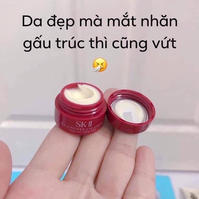 Kem mắt SKII làm trẻ hóa vùng da quanh mắt và xóa tan 10 vấn đề lo ngại : ☄ Sự hydrát hóa ☄ Không cân bằng sắc tố da ☄ Sự xuất hiện các nếp nhăn quanh mắt ☄ Độ trắng sáng quanh mắt ☄ Những quầng đen quanh mắt ☄ Mắt bị sẫm màu ☄ Sức khỏe của mắt ☄ Sự săn chắc quanh vùng mắt ☄ Các chức năng hàng rào ☄ Độ mềm mịn quanh mắt. ❤ Với công thức tiên tiến chống lão hóa chứa các hỗn hợp bao gồm Pitera đậm đặc. Mang lại cho bạn làn da săn chắc ngay từ lần đầu tiên sử dụng. + Giúp da vùng mắt săn chắc, + Xóa mờ nếp nhăn, + Xóa tan bọng mắt, + Xóa quầng thâm mắt. ❤ Lọ mini chứ cũng xài được 2-3 tháng, giá lại rất tiết kiệm so với mua hũ full size 15g. Các bạn mua dự trữ ạ, giá rất yêu, hàng nội địa Nhật chuẩn 100 >>> Cách dùng Sau khi rửa mặt xong, sử dụng sản phẩm nước hoa hồng làm sạch vùng da xung quanh mắt bán kính 0,5cm và xoa đều sử dụng ngón tay đeo nhẫn.