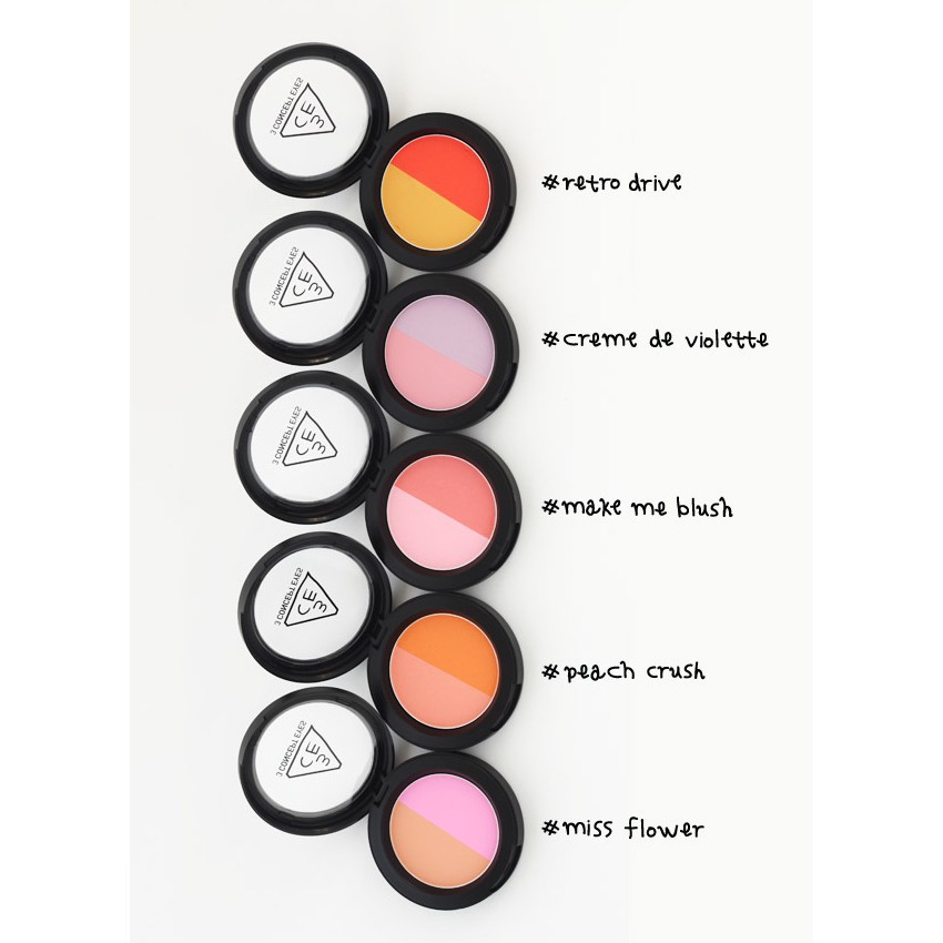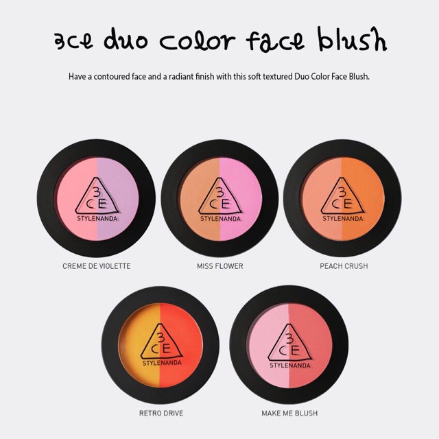 Trong mỗi hộp phấn má hồng 3CE Duo Color Face Blush có 2 màu giúp bạn tạo hiệu ứng chuyển màu tự nhiên và dễ dàng hơn, mang đến cho bạn khuôn mặt rạng ngời hơn. Chất phấn siêu min, độ bám cao và không trôi khi ra mồ hôi. Với tông màu tươi sáng không nhũ sẽ đem đến vẻ đẹp tự nhiên cho các nàng. Phấn má hồng 2 màu 3CE Duo Face Blush có thể mix 2 màu cùng với nhau, hoặc sử dụng riêng lẻ từng màu. Với thành phần từ bột khoáng và ngọc trai, sản phẩm mang lại màu sắc nhẹ nhàng, tươi xinh. Giúp bạn có thể sở hữu nhiều tone màu khác nhau khi mix những màu sắc từ 3CE Duo Color Face Blush.
