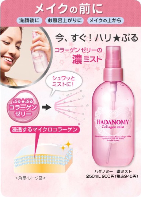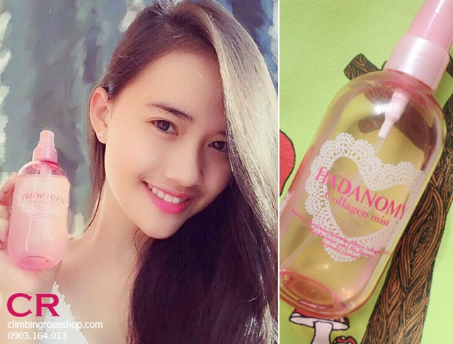 #Xịtkhoáng dưỡng da #Hadanomy Collagen Mist Giá: 300.000₫ Dung tích: 250ml. Xuất xứ: Nhật Bản. - Với tinh chất Collagen, xịt khoáng HADANOMY cung cấp độ ẩm cho da, tái tạo vùng da bị lão hóa. - Hadanomi Collagen Mist là hỗn hợp nước dưỡng da dạng phun sương vô cùng bổ dưỡng cho da khi chứa tới 1000mg Micro Collagen - Nước dưỡng da Hadanomi Collagen Mist cung cấp độ ẩm cho da với sự kết hợp của Micro Collagen 10000mg, chất nhờn liên kết tế bào Hyaluronic Acid Na, mật ong rừng, và tinh chất Acerola. Dưỡng chất này sẽ thấm sâu vào từng lớp biểu bì, tái tạo da lão hóa, làm mềm và tăng độ đàn hồi cho da. Hương hoa thiên nhiên. - Không chứa phẩm màu, không chứa dầu khoáng. Cách sử dụng - Xịt vào da mặt (để cách xa da mặt 15cm) - Nước dưỡng này có thể dùng sau khi tắm, sau khi rửa mặt, trước khi hoặc sau khi trang điểm. - Sau khi xịt, lấy lòng bàn tay vỗ nhẹ vào mặt để tăng độ thẩm thấu • Lưu ý: - Không nên dùng cho vùng da đang bị ngứa, sưng hay cháy nắng. - Ngưng sử dụng nếu thấy ngứa, mẩn đỏ. - Rửa tay sạch trước khi sử dụng