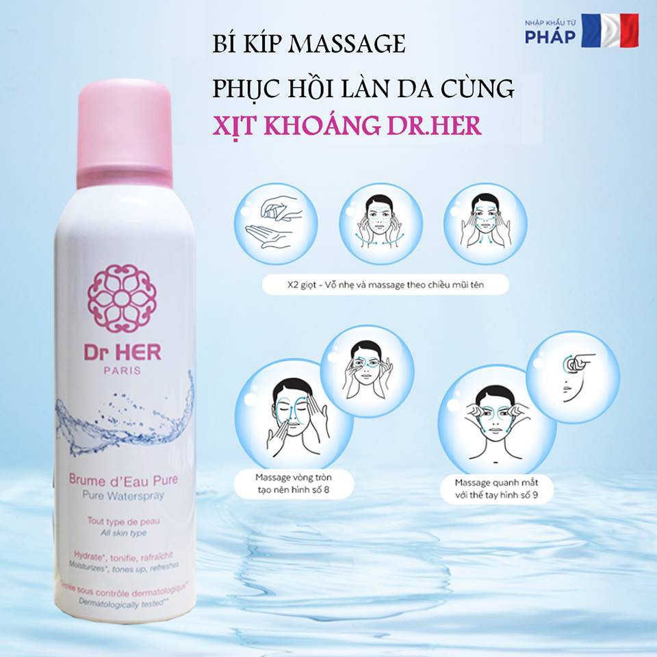 Xịt Khoáng Dr. Her 150ml Thành phần chính của xịt khoáng Dr Her là nước tinh khiết và nitrogen (Nitơ) sẽ giúp nhanh chóng làm dịu những tổn thương của da do môi trường và sự mất nước theo thời gian. Ngoài ra, sản phẩm còn được bổ sung khá nhiều khoáng chất như: Ca, Na, Mg, Zn… chứa trong chính nước khoáng tạo nên sản phẩm. Ưu điểm Cấp ẩm cho da Xịt khoáng Dr Her sẽ giúp gỉam tối đa những biến chứng gây cho da như: nứt nẻ, bong tróc, cung cấp độ ẩm tốt. Bạn sẽ luôn sở hữu một làn da mịn mướt, căng đều và tràn đầy sức sống. An toàn cho da Sản phẩm chiết xuất hoàn toàn từ tự nhiên giúp dưỡng ẩm, an toàn và không hề gây bất kỳ tác dụng phụ nào cho da. Xịt khoáng pháp Dr Her không có mùi, không gây bóng nhờn, không nhớp dính, phù hợp với mọi loại da, kể cả là da nhạy cảm. Hướng dẫn sử dụng: Sử dụng xịt khoảng ít nhất từ 1-3 lần mỗi ngày để làn da luôn được tươi trẻ và cung cấp đủ lượng nước giúp da mềm mại và tăng độ đàn hồi cho da suốt ngày dài. Bạn có thể sử dụng Dr Her khi: Trước và sau khi đi nắng về giúp làm dịu mát, thư giãn hơn. Sau khi rửa mặt, trước khi đi ngủ. Sử dụng thường xuyên cho da cổ, body Sau khi đi tắm, trước khi đi ngủ Trước và sau khi trang điểm Hạn sử dụng: 3 năm từ ngày sản xuất.
