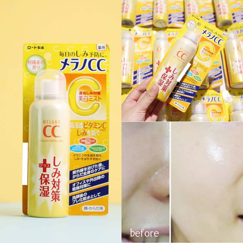 Xịt khoáng dưỡng trắng Melano CC Rohto Nhật Bản Chứa dẫn xuất vitamin C ngăn chặn chặn các đốm đen hình thành trên da đồng thời loại bỏ chúng. Bằng cách ức chế quá trình sản xuất melanin hiệu quả, Vitamin C sẽ thấm sâu vào da bạn và nhanh chóng làm mờ dần và ngăn chặn những vết tàn nhang, sạm da, nám da…. Đặc biệt sả phẩm chứa Dipotassium Glycyrrhyzate (chất chống viêm) và White Alpinia có công dụng vừa làm giảm tấy đỏ và kích ứng, vừa điều chỉnh tông màu da không đồng đều. Chiết xuất chanh và bưởi tích cực dưỡng ẩm và làm sáng da. Chai dạng phun sương tiện lợi để bạn mang theo bên người và sử dụng bất cứ lúc nào. Chỉ cần phun lên da là ngay lập tức thấm đều vào da và phát huy tác dụng tiêu diệt các đốm đen đáng ghét. Hương chanh tươi mát sảng khoái. #colenbo #ccmelano #xitkhoang