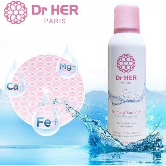 Muốn làn da mướt mịn, căng bóng,…Vậy còn lý do gì mà nàng chưa sử dụng "item" xịt khoáng Dr.Her - Paris nhỉ? Một sản phẩm cực quan trọng của các nàng trong quá trình dưỡng da đó nhé! Thành phần chính của xịt khoáng Dr Her Paris Pure Water Spray là nước tinh khiết và nitrogen (Nitơ) sẽ giúp nhanh chóng làm dịu những tổn thương của da do môi trường và sự mất nước theo thời gian. Ngoài ra, sản phẩm còn được bổ sung khá nhiều khoáng chất như: Ca, Na, Mg, Zn… chứa trong chính nước khoáng tạo nên sản phẩm.