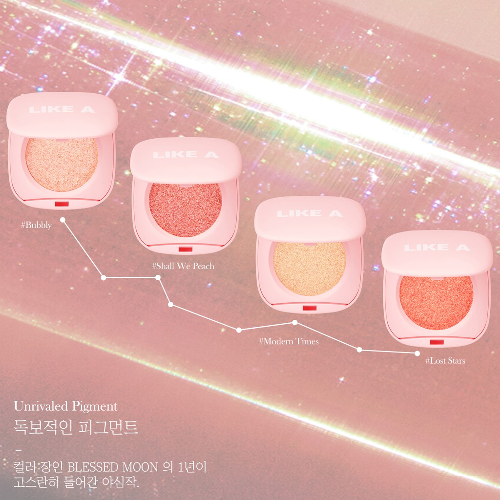 Of course, the sheer radiance, Various shining depending on the angle "The Milky Way Glitter Shadow" A color that shines brightly as if it contained the universe that came near your eyes. Golden ratio found by BlessedMoon. BlessedMoon’s “Sustainability King” 3 main ingredients in shadow 1. Oil coated particles It is a lightly compressed formulation of oil-coated particles, so you can see the moist reflection effect without blowing powder. 2. Serum control formulation Serum control formulation that catches oily eyes and keeps any eye area long without smearing or crease. 3. Plant-derived silica powder It contains plant-derived silica powder. Glitter eye shadow 2 times larger than the average of the existing shadows Compared to the existing eye shadow capacity, the capacity that is incomparable & overwhelming Average capacity per 1 existing shadow: 1.5g LIKE A SHADOW Capacity: 3g