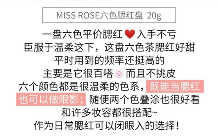 Brand miss rose Product name six color blush China of origin Color classification 1#Two fine pearl+four mattes, 2#Six colors matte Approval number guangdong g makeup net preparation word 201927660 Effect enhancement Specification type normal specification No special purpose cosmetics