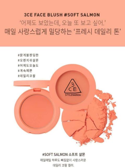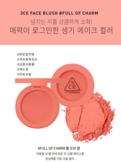 🌈🌈Phấn má 3CE Face Blush🌈🌈 ✨Thương hiệu: 3CE 🌺🌺 Mình có sẵn 4 màu: ✔️Peach Spash ✔️Full of charm ✔️Rose beige ✔️Soft salmon ✔️Phấn má hồng 3CE mang sắc màu tươi tắn, tạo nét hồng xinh rạng ngời cho gương mặt bạn khi trang điểm. ✔️Mang khuôn mặt rạng rỡ, nhẹ nhàng, che khiếm khuyết của vùng da ở hai gò má. ✔️Phù hợp nhiều độ tuổi. ✔️Hạt phấn sáng nhỏ li ti mang đến sự tươi trẻ giúp khuôn mặt sáng lấp. ✔️Độ bám cao, giữ màu lâu , không sợ mồ hôi làm trôi. ✔️Hộp phấn nhỏ gọn, tiện dụng, là bạn đồng hành của các bạn gái ✔️Phấn má hồng 3CE hiện rất được ưa chuộng giúp làn da bạn gái trở nên sáng và mềm mại hơn thể hiện sự trẻ trung, năng động cho phụ nữ. ✔️Phấn má hồng 3CE có độ bám cao, giữ màu lâu , không sợ mồ hôi làm trôi đi lớp phấn mình vừa bỏ công chăm chút. ✔️Hạt phấn sáng nhỏ li ti mang đến sự tươi trẻ giúp khuôn mặt bạn sáng lấp lánh diệu kỳ dưới ánh đèn và càng hồng hào hơn khi đi dưới nắng. -------- 📍