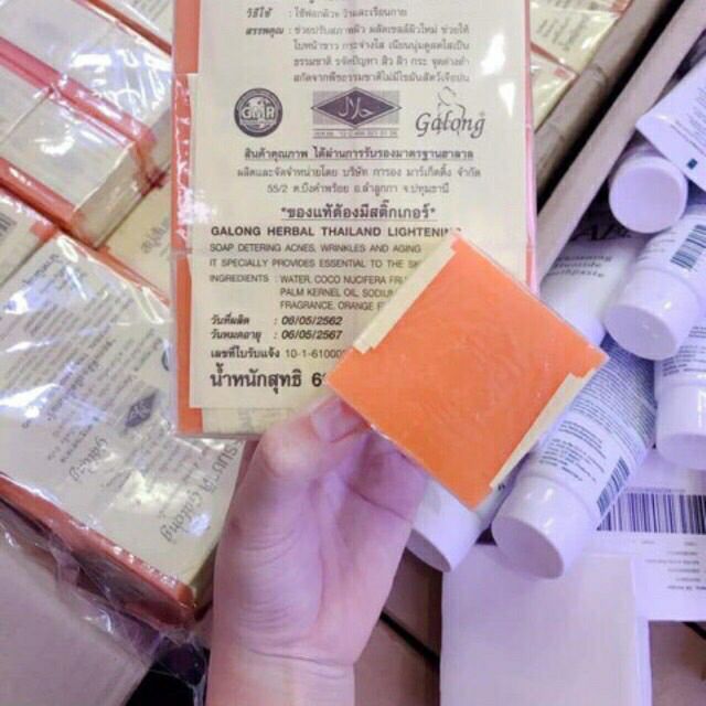 Chi tiết sản phẩm: ✓ Thương hiệu: Galong ✓ Xuất xứ: Thái Lan ✓ Khối lượng: 70g/cục ✓ Kích thước: 5 x 5 x 2.2cm ✓ Ngày sản xuất: Xem trên bao bì ✓ Hạn sử dụng: 36 tháng -----------------------------||-------------------------------- - Với thành phần chính từ cam, vitamin C, collagen & Glutathione (kho chất chống oxy hoá & lão hoá da) sẽ giúp trẻ hoá, da sáng mịn màng. - Có thể dùng rửa mặt hoặc tắm toàn thân. - Hạn chế mụn cám & mụn đầu đen. - Giúp da sáng lên trông thấy sau khi sử dụng vài bánh xà phòng này. -----------------------------||-------------------------------- ✨HƯỚNG DẪN SỬ DỤNG: Làm ướt mặt (hoặc cơ thể), chà một lớp xà phòng trong vòng 2 – 3 phút, massage nhẹ nhàng rồi rửa sạch. Cảm nhận rõ sự khác biệt chỉ sau lần rửa đầu tiên.