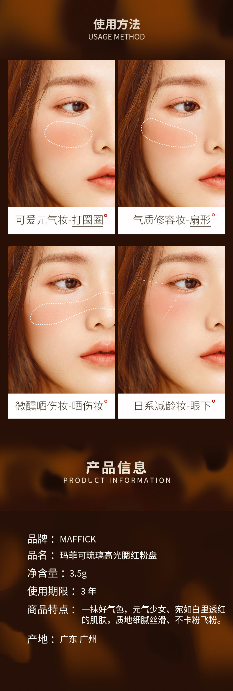Brand: MAFFICK Item No.: Glazed Amber Blush MF090 Color: single color Model: Glazed Amber Blush MF090 Specifications: normal specifications Shelf life: 36 months Have licensable own brand: Yes Skin Type: General Color: 01#Raspberry Black Tea 02#Camellia coffee 03#Rose cheese 04#Caramel Milk Tea 05#Tree Yogurt Jelly 06 Earl Amber Brand Type: Chinese Brand Special purpose cosmetics: No Category: blush, rouge