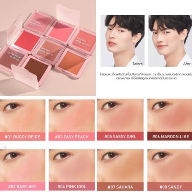 ☘Phấn má hồng cathy doll nude matte blusher☘ -----------------🥰🥰🥰--------------- ☘Phấn Má Hồng Cathy Doll Nude Matte Blusher 6g là dòng má hồng đến từ thương hiệu mỹ phẩm Cathy Doll của Thái Lan, thành phần chứa bột Silica hình cầu cải tiến với kích thước siêu nhỏ 5-7 micron giúp phấn má tệp vào da tự nhiên đồng thời che phủ lỗ chân lông mang đến lớp nền mịn màng, hồng hào. 🌷Hiện sản phẩm Phấn Má Hồng Cathy Doll Nude Matte Blusher 6g đã có mặt tại ansan với 3 màu: 🥰• 01 Buddy Beige •🥰 03 Baby Boy •🥰 04 Pink Idol 😽Loại da phù hợp:😽 Sản phẩm phù hợp với mọi loại da. 🌷Giải pháp tình trạng: •🧜 Thường xuyên trang điểm mỗi ngày. •🧜 Muốn lớp trang điểm hồng hào, tươi tắn. Ưu thế nổi bật: •🧜 Hạt phấn siêu mịn tạo hiệu ứng mịn lì không gây bóng nhờn đồng thời che phủ lỗ chân lông, giảm tiết bã nhờn hiệu quả. •🧜Kết cấu mỏng nhẹ không gây dày nặng mặt mang đến lớp nền nhẹ nhàng, thoải mái. •🧜 Độ lên màu cao và dễ tán giúp thao tác cọ dễ dàng phù hợp đánh mọi layout trang điểm. •🧜 Lớp phấn má hồng bền màu lâu trôi suốt cả ngày giữ nét tươi tắn, tự tin.